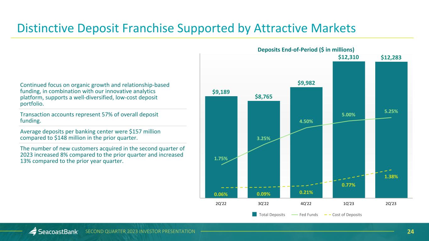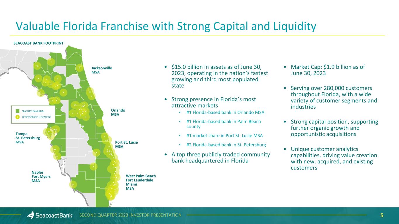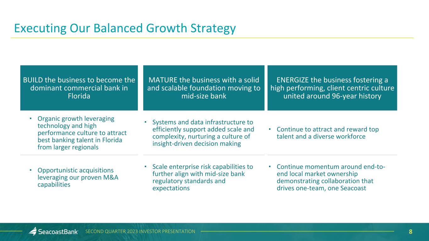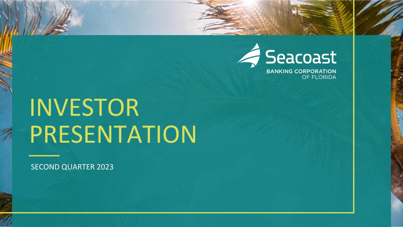 2SECOND QUARTER 2023 INVESTOR PRESENTATION This presentation contains “forward-looking statements” within the meaning, and protections, of Section 27A of the Securities Act of 1933, as amended, and Section 21E of the Securities Exchange Act of 1934, as amended, including, without limitation, statements about future financial and operating results, cost savings, enhanced revenues, economic and seasonal conditions in the Company’s markets, and improvements to reported earnings that may be realized from cost controls, tax law changes, new initiatives and for integration of banks that the Company has acquired, including Professional Holding Corp., or expects to acquire, as well as statements with respect to Seacoast's objectives, strategic plans, expectations and intentions and other statements that are not historical facts. Actual results may differ from those set forth in the forward-looking statements. Forward-looking statements include statements with respect to the Company’s beliefs, plans, objectives, goals, expectations, anticipations, assumptions, estimates and intentions about future performance, and involve known and unknown risks, uncertainties and other factors, which may be beyond the Company’s control, and which may cause the actual results, performance or achievements of Seacoast Banking Corporation of Florida (“Seacoast” or the “Company”) or its wholly-owned banking subsidiary, Seacoast National Bank (“Seacoast Bank”), to be materially different from results, performance or achievements expressed or implied by such forward-looking statements. You should not expect the Company to update any forward-looking statements. All statements other than statements of historical fact could be forward-looking statements. You can identify these forward- looking statements through the use of words such as "may", "will", "anticipate", "assume", "should", "support", "indicate", "would", "believe", "contemplate", "expect", "estimate", "continue", "further", "plan", "point to", "project", "could", "intend", "target" or other similar words and expressions of the future. These forward-looking statements may not be realized due to a variety of factors, including, without limitation: the impact of current and future economic and market conditions generally (including seasonality) and in the financial services industry, nationally and within Seacoast’s primary market areas, including the effects of inflationary pressures, changes in interest rates, slowdowns in economic growth, and the potential for high unemployment rates, as well as the financial stress on borrowers and changes to customer and client behavior and credit risk as a result of the foregoing; potential impacts of the recent adverse developments in the banking industry highlighted by high- profile bank failures, including impacts on customer confidence, deposit outflows, liquidity and the regulatory response thereto; governmental monetary and fiscal policies, including interest rate policies of the Board of Governors of the Federal Reserve, as well as legislative, tax and regulatory changes, including those that impact the money supply and inflation and the possibility that the U.S. could default on its debt obligations; the risks of changes in interest rates on the level and composition of deposits (as well as the cost of, and competition for, deposits), loan demand, liquidity and the values of loan collateral, securities, and interest rate sensitive assets and liabilities; interest rate risks, sensitivities and the shape of the yield curve; changes in accounting policies, rules and practices; changes in retail distribution strategies, customer preferences and behavior generally and as a result of economic factors; changes in the availability and cost of credit and capital in the financial markets; changes in the prices, values and sales volumes of residential and commercial real estate; the Company’s concentration in commercial real estate loans and in real estate collateral in Florida; Seacoast’s ability to comply with any regulatory requirements; the effects of problems encountered by other financial institutions that adversely affect Seacoast or the banking industry; inaccuracies or other failures from the use of models, including the failure of assumptions and estimates, as well as differences in, and changes to, economic, market and credit conditions; the impact on the valuation of Seacoast’s investments due to market volatility or counterparty payment risk, as well as the effect of a decline in stock market prices on our fee income from our wealth management business; statutory and regulatory dividend restrictions; increases in regulatory capital requirements for banking organizations generally; the risks of mergers, acquisitions and divestitures, including Seacoast’s ability to continue to identify acquisition targets, successfully acquire and integrate desirable financial institutions and realize expected revenues and revenue synergies; changes in technology or products that may be more difficult, costly, or less effective than anticipated; the Company’s ability to identify and address increased cybersecurity risks; fraud or misconduct by internal or external, which Seacoast may not be able to prevent, detect or mitigate; inability of Seacoast’s risk management framework to manage risks associated with the Company’s business; dependence on key suppliers or vendors to obtain equipment or services for the business on acceptable terms, including the impact of supply chain disruptions; reduction in or the termination of Seacoast’s ability to use the online- or mobile-based platform that is critical to the Company’s business growth strategy; the effects of war or other conflicts, including the impacts related to or resulting from Russia’s military action in Ukraine, acts of terrorism, natural disasters, including hurricanes in the Company’s footprint, health emergencies, epidemics or pa