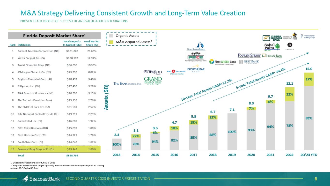 5SECOND QUARTER 2023 INVESTOR PRESENTATION • $15.0 billion in assets as of June 30, 2023, operating in the nation’s fastest growing and third most populated state • Strong presence in Florida’s most attractive markets ▪ #1 Florida-based bank in Orlando MSA ▪ #1 Florida-based bank in Palm Beach county ▪ #1 market share in Port St. Lucie MSA ▪ #2 Florida-based bank in St. Petersburg • A top three publicly traded community bank headquartered in Florida • Market Cap: $1.9 billion as of June 30, 2023 • Serving over 280,000 customers throughout Florida, with a wide variety of customer segments and industries • Strong capital position, supporting further organic growth and opportunistic acquisitions • Unique customer analytics capabilities, driving value creation with new, acquired, and existing customers Jacksonville MSA West Palm Beach Fort Lauderdale Miami MSA Port St. Lucie MSA Orlando MSA Tampa St. Petersburg MSA Naples Fort Myers MSA Valuable Florida Franchise with Strong Capital and Liquidity SEACOAST BANK FOOTPRINT