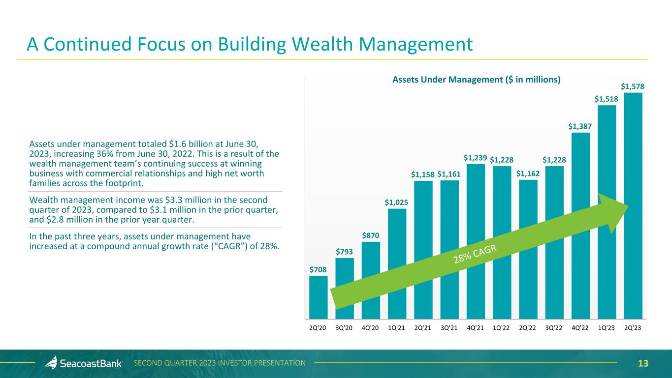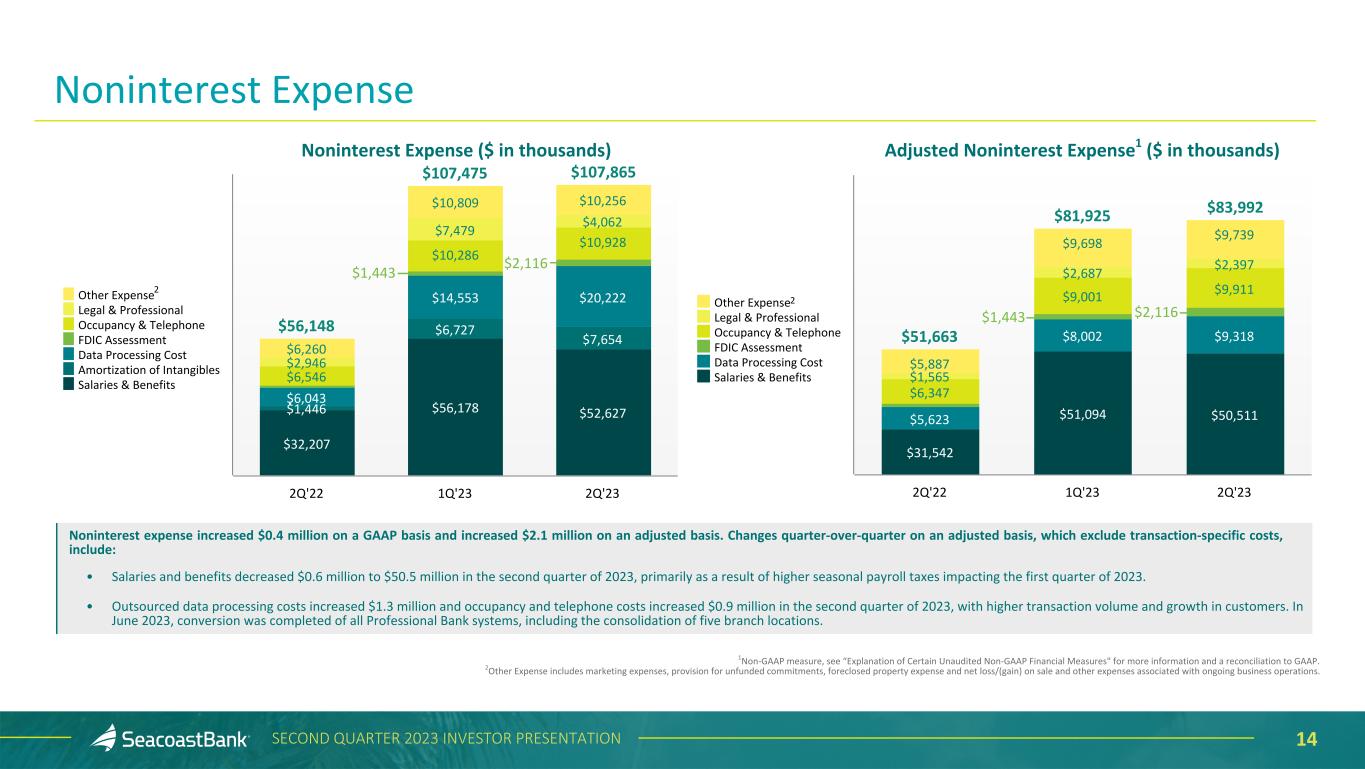 12SECOND QUARTER 2023 INVESTOR PRESENTATION $17,264 $20,221 $21,752 $3,408 $4,242 $4,560 $4,255 $4,694 $5,066 $2,774 $3,063 $3,318$932 $426 $576$4,546 $4,779 $5,004$1,349 $1,916 $2,068 BOLI Other Income Insurance Agency Income Mortgage Banking Wealth Management Interchange Income Service Charges 2Q'22 1Q'23 2Q'23 $16,964 $22,445 $21,576 $3,408 $4,242 $4,560 $4,255 $4,694 $5,066 $2,774 $3,063 $3,318$932 $426 $576$4,246 $7,003 $4,828 $1,349 $1,916 $2,068 BOLI Other Income Insurance Agency Income Mortgage Banking Wealth Management Interchange Income Service Charges 2Q'22 1Q'23 2Q'23 Adjusted Noninterest Income1 ($ in thousands) 2 3 Noninterest Income ($ in thousands) 1 Non-GAAP measure, see “Explanation of Certain Unaudited Non-GAAP Financial Measures" for more information and a reconciliation to GAAP. 2 Other Income includes income and gains on SBIC investments, SBA gains, marine finance fees, and other fees related to customer activity as well as $2.1 million BOLI benefits on death in 1Q’23, and securities losses of $300 thousand in 2Q’22, gains of $107 thousand in 1Q'23 and losses of $176 thousand in 2Q'23. 3 Other Income on an adjusted basis includes income and gains on SBIC investments, SBA gains, marine finance fees, and other fees related to customer activity. Noninterest Income Noninterest income decreased $0.9 million from the prior quarter to $21.6 million, and adjusted noninterest income1 increased $1.5 million to $21.8 million. Changes on an adjusted basis include: • Service charges on deposits increased $0.3 million compared to the prior quarter and increased $1.2 million compared to the prior year quarter, benefiting from a continued focus on driving higher treasury fees. • Interchange income totaled $5.1 million in the second quarter, an increase of $0.4 million, or 8%, when compared to the prior quarter and $0.8 million, or 19%, compared to the prior year quarter. As a reminder, in the third quarter interchange income will decline as a result of the impact of the Durbin amendment. • The wealth management division continues to demonstrate success in building relationships, and during the second quarter of 2023, income increased $0.3 million, or 8%, compared to the prior quarter and $0.5 million, or 20%, compared to the prior year quarter. The group added $60 million in assets under management in the second quarter of 2023, bringing total assets under management to $1.6 billion, up 36% from the prior year. $1,101 $1,101 $1,160 $1,160
