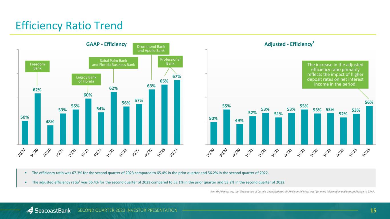 14SECOND QUARTER 2023 INVESTOR PRESENTATION $51,663 $81,925 $83,992 $31,542 $51,094 $50,511$5,623 $8,002 $9,318 $6,347 $9,001 $9,911 $1,565 $2,687 $2,397 $5,887 $9,698 $9,739 Other Expense Legal & Professional Occupancy & Telephone FDIC Assessment Data Processing Cost Salaries & Benefits 2Q'22 1Q'23 2Q'23 $56,148 $107,475 $107,865 $32,207 $56,178 $52,627$1,446 $6,727 $7,654 $6,043 $14,553 $20,222 $6,546 $10,286 $10,928 $2,946 $7,479 $4,062 $6,260 $10,809 $10,256 Other Expense Legal & Professional Occupancy & Telephone FDIC Assessment Data Processing Cost Amortization of Intangibles Salaries & Benefits 2Q'22 1Q'23 2Q'23 Adjusted Noninterest Expense1 ($ in thousands) 2 2 Noninterest Expense ($ in thousands) Noninterest expense increased $0.4 million on a GAAP basis and increased $2.1 million on an adjusted basis. Changes quarter-over-quarter on an adjusted basis, which exclude transaction-specific costs, include: • Salaries and benefits decreased $0.6 million to $50.5 million in the second quarter of 2023, primarily as a result of higher seasonal payroll taxes impacting the first quarter of 2023. • Outsourced data processing costs increased $1.3 million and occupancy and telephone costs increased $0.9 million in the second quarter of 2023, with higher transaction volume and growth in customers. In June 2023, conversion was completed of all Professional Bank systems, including the consolidation of five branch locations. 1Non-GAAP measure, see “Explanation of Certain Unaudited Non-GAAP Financial Measures" for more information and a reconciliation to GAAP. 2Other Expense includes marketing expenses, provision for unfunded commitments, foreclosed property expense and net loss/(gain) on sale and other expenses associated with ongoing business operations. Noninterest Expense $1,443 $1,443 $2,116 $2,116
