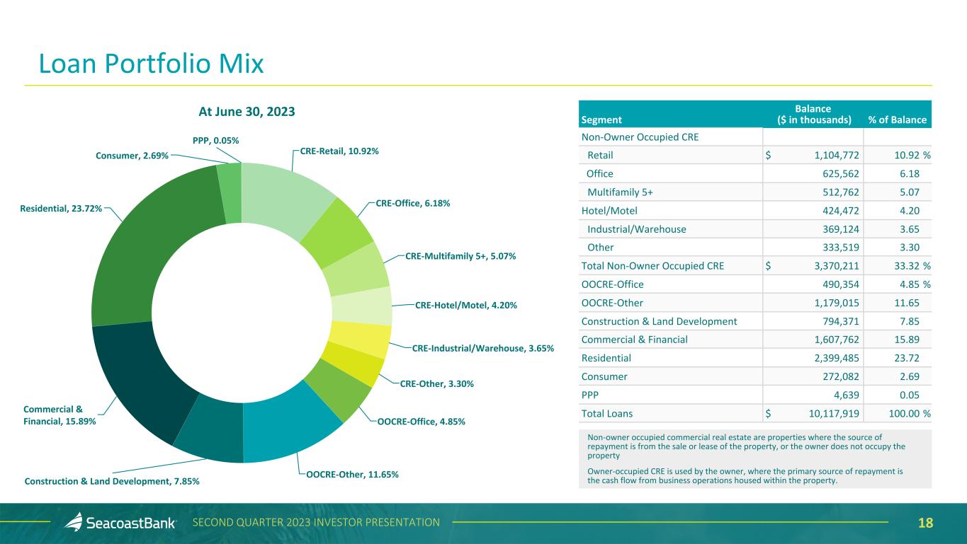 17SECOND QUARTER 2023 INVESTOR PRESENTATION Commercial Real Estate - Owner Occupied $1,669,369 16% Construction and Land Development $794,371 8% Consumer $272,082 3% Commercial & Financial $1,610,895 16% Commercial Real Estate - Non-Owner Occupied $3,370,211 33% Residential Real Estate $2,396,352 24% At June 30, 2023 ($ in thousands) Seacoast's Lending Strategy Sustains a Diverse Loan Portfolio The Company remains focused and committed to its strict credit underwriting standards. Construction and land development and commercial real estate loans, as defined in regulatory guidance, represent 48% and 241%, respectively, of total consolidated risk based capital. Seacoast’s average loan size is $278 thousand and the average commercial loan size is $685 thousand. Portfolio diversification in terms of asset mix, industry, and loan type, has been a critical element of the Company’s lending strategy. Exposure across industries and collateral types are broadly distributed. Construction & Land Development and CRE Loans to Total Risk Based Capital 278% 241% 66% 48% CRE Construction & Land Development Peers SBCF Peer Source: 1Q’23 S&P Capital Paycheck Protection Program $4,639 <1%