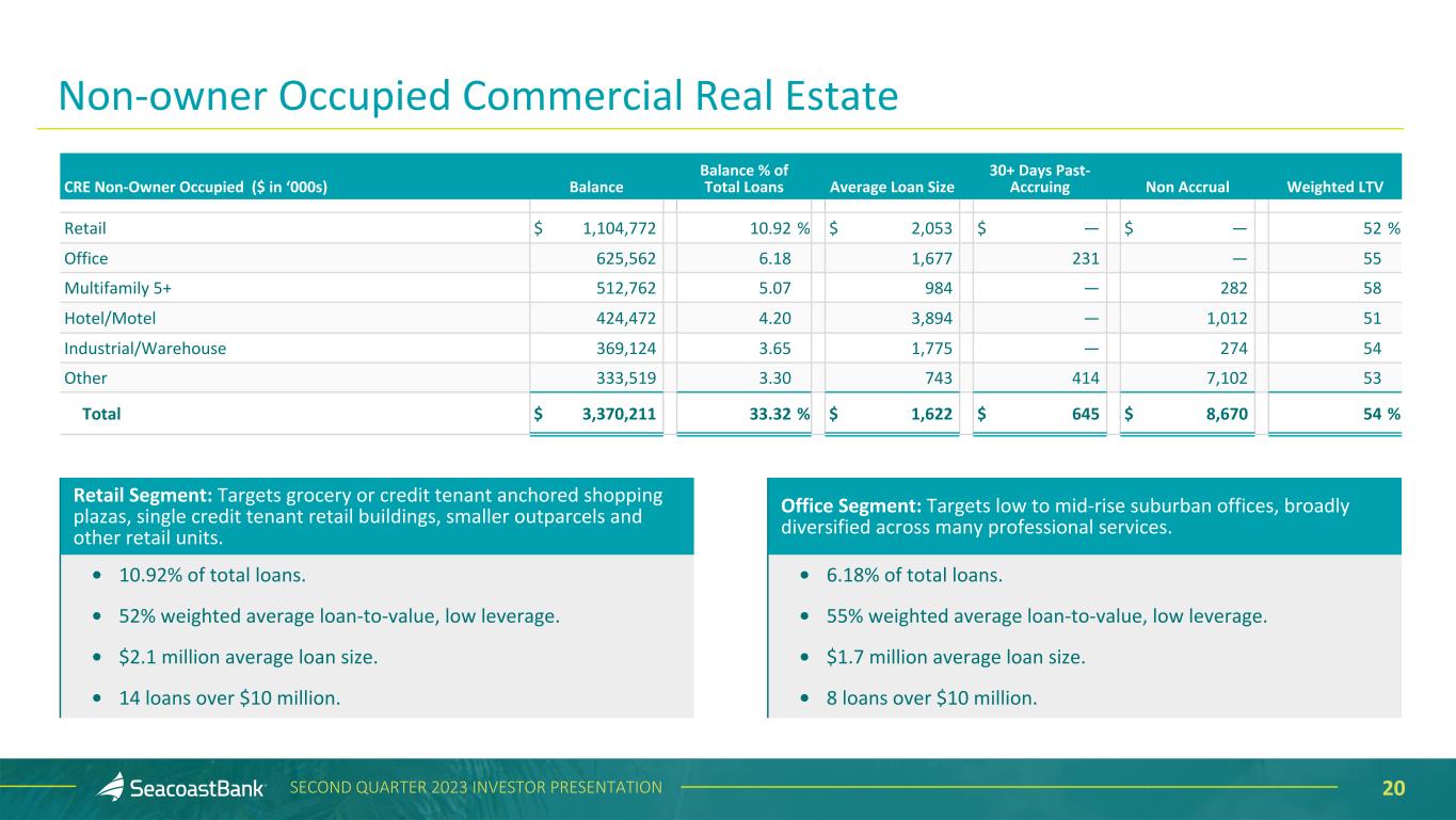 19SECOND QUARTER 2023 INVESTOR PRESENTATION Non-owner Occupied Commercial Real Estate in Florida’s Strongest Markets Non-owner Occupied Commercial Real Estate by MSA Balance ($ in thousands) Balance % of Total Loans Miami / Dade County $ 656,823 6.49 % Orlando-Kissimmee, FL MSA 472,068 4.67 Ft. Lauderdale / Broward County 382,258 3.78 West Palm Beach / Palm Beach County 369,782 3.65 Tampa-St. Petersburg-Clearwater, FL 199,910 1.98 Sarasota-Bradenton-Venice, FL MSA 145,920 1.44 Deltona-Daytona Beach-Ormond Beach, FL MSA 112,885 1.12 Port St. Lucie, FL MSA 110,149 1.09 Jacksonville, FL MSA 108,936 1.08 Palm Bay-Melbourne-Titusville, FL MSA 94,854 0.94 All Other FL 547,930 5.41 Outside FL 168,696 1.67 14% of total loans in vibrant, South Florida tri- county area. Between 2010 and 2020, Florida’s population grew 14.6%, twice the rate of overall U.S. population growth. Florida has been the top state for net in-migration for the past five years. Compared to national average, Florida office has better absorption, 24% lower vacancy, and about half the volume of new supply coming to market. Sources: U.S. Census data, JLL