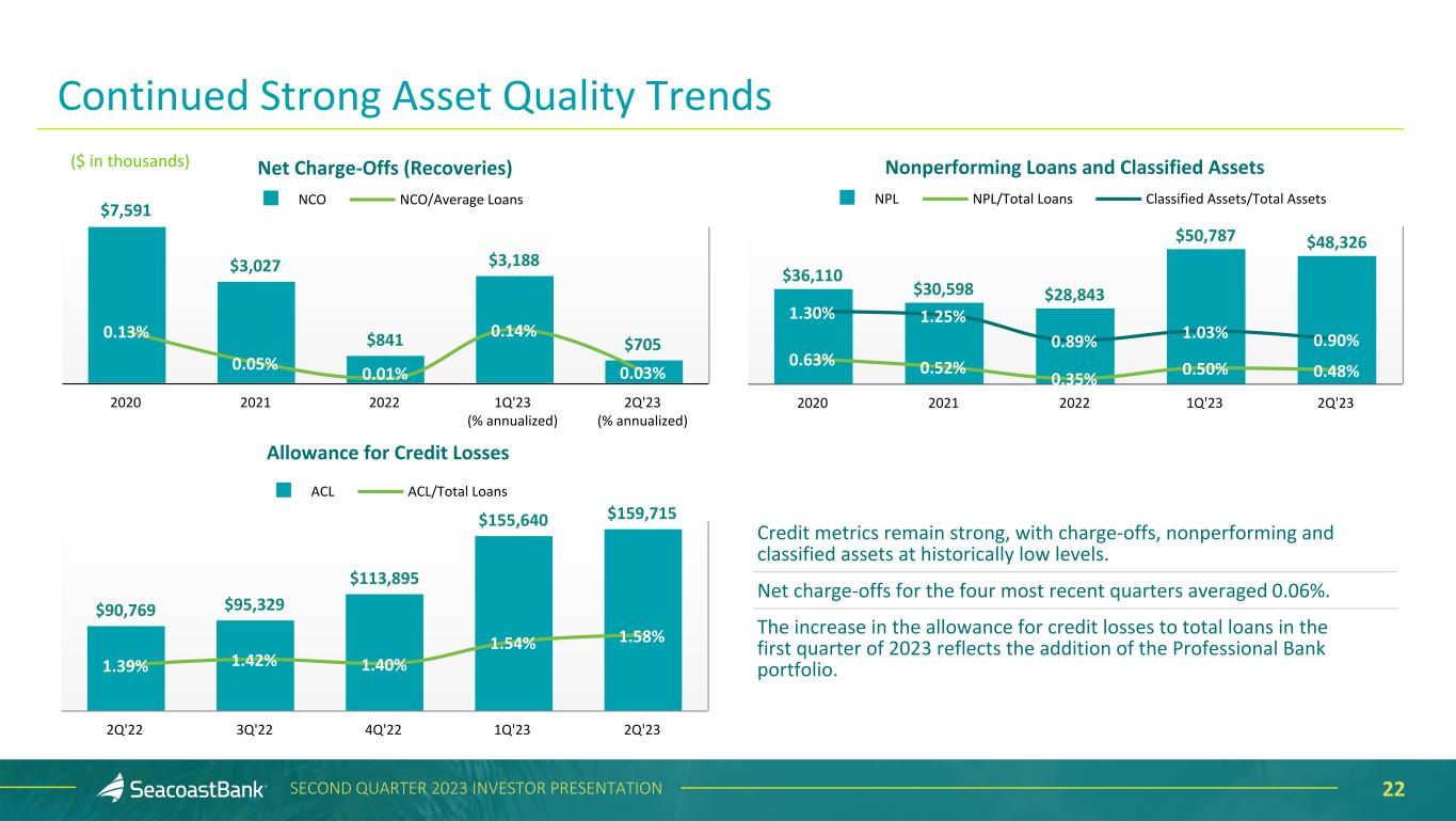 21SECOND QUARTER 2023 INVESTOR PRESENTATION Allowance for Credit Losses and Purchase Discount ($ in thousands) Loans Outstanding Allowance for Credit Losses % of Category Purchase Discount % of Category Construction and Land Development $ 794,371 $ 6,960 0.88 % $ 11,882 1.50 % Owner Occupied Commercial Real Estate 1,669,369 6,418 0.38 30,514 1.83 Commercial Real Estate 3,370,211 54,103 1.61 92,287 2.74 Residential Real Estate 2,396,352 36,710 1.53 34,959 1.46 Commercial & Financial 1,610,895 40,272 2.50 28,113 1.75 Consumer 272,082 15,252 5.61 4,063 1.49 Total Excluding PPP $ 10,113,280 $ 159,715 1.58 % $ 201,818 2.00 % Paycheck Protection Program $ 4,639 $ — — % $ — — % Total $ 10,117,919 $ 159,715 1.58 % $ 201,818 1.99 % The total allowance for credit losses of $159.7 million as of June 30, 2023, represents management’s estimate of lifetime expected credit losses. Combined with the $201.8 million remaining unrecognized discount on acquired loans, a total of $361.5 million, or 3.6%, of total loans is available to cover potential losses. As acquired loans are repaid, the unrecognized discount is earned as an adjustment to yield over the life of the loans. Additionally, a reserve for potential credit losses on lending-related commitments of $4.7 million is reflected within Other Liabilities.