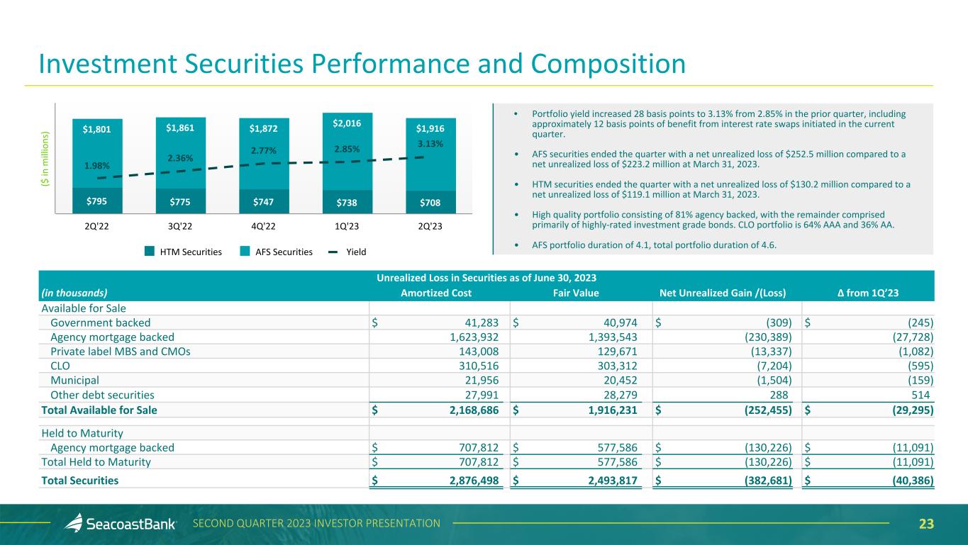 22SECOND QUARTER 2023 INVESTOR PRESENTATION Net Charge-Offs (Recoveries) $3,027 $841 $3,188 $705 0.13% 0.05% 0.01% 0.14% 0.03% NCO NCO/Average Loans 2020 2021 2022 1Q'23 (% annualized) 2Q'23 (% annualized) ($ in thousands) Nonperforming Loans and Classified Assets $36,110 $30,598 $28,843 $50,787 $48,326 0.63% 0.52% 0.35% 0.50% 0.48% 1.30% 1.25% 0.89% 1.03% 0.90% NPL NPL/Total Loans Classified Assets/Total Assets 2020 2021 2022 1Q'23 2Q'23 $90,769 $95,329 $113,895 $155,640 $159,715 1.39% 1.42% 1.40% 1.54% 1.58% ACL ACL/Total Loans 2Q'22 3Q'22 4Q'22 1Q'23 2Q'23 Allowance for Credit Losses Continued Strong Asset Quality Trends Credit metrics remain strong, with charge-offs, nonperforming and classified assets at historically low levels. Net charge-offs for the four most recent quarters averaged 0.06%. The increase in the allowance for credit losses to total loans in the first quarter of 2023 reflects the addition of the Professional Bank portfolio. $7,591