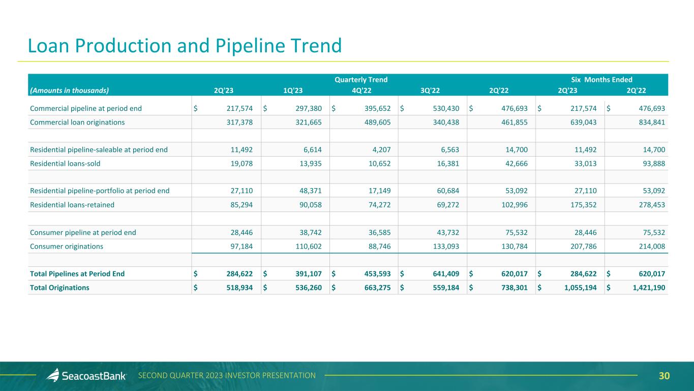 30SECOND QUARTER 2023 INVESTOR PRESENTATION Quarterly Trend Six Months Ended (Amounts in thousands) 2Q'23 1Q'23 4Q'22 3Q'22 2Q'22 2Q'23 2Q'22 Commercial pipeline at period end $ 217,574 $ 297,380 $ 395,652 $ 530,430 $ 476,693 $ 217,574 $ 476,693 Commercial loan originations 317,378 321,665 489,605 340,438 461,855 639,043 834,841 Residential pipeline-saleable at period end 11,492 6,614 4,207 6,563 14,700 11,492 14,700 Residential loans-sold 19,078 13,935 10,652 16,381 42,666 33,013 93,888 Residential pipeline-portfolio at period end 27,110 48,371 17,149 60,684 53,092 27,110 53,092 Residential loans-retained 85,294 90,058 74,272 69,272 102,996 175,352 278,453 Consumer pipeline at period end 28,446 38,742 36,585 43,732 75,532 28,446 75,532 Consumer originations 97,184 110,602 88,746 133,093 130,784 207,786 214,008 Total Pipelines at Period End $ 284,622 $ 391,107 $ 453,593 $ 641,409 $ 620,017 $ 284,622 $ 620,017 Total Originations $ 518,934 $ 536,260 $ 663,275 $ 559,184 $ 738,301 $ 1,055,194 $ 1,421,190 Loan Production and Pipeline Trend
