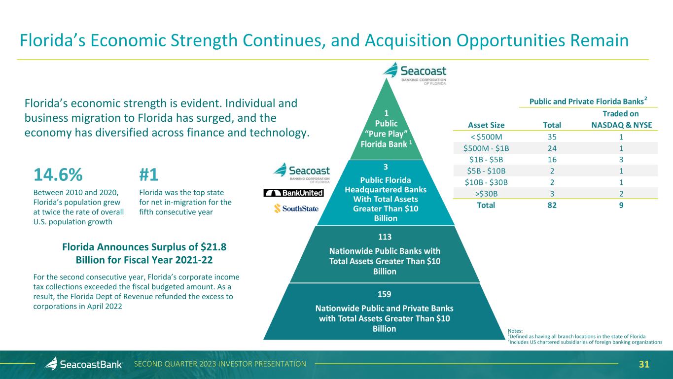 31SECOND QUARTER 2023 INVESTOR PRESENTATION Florida’s Economic Strength Continues, and Acquisition Opportunities Remain Florida’s economic strength is evident. Individual and business migration to Florida has surged, and the economy has diversified across finance and technology. 14.6% Between 2010 and 2020, Florida’s population grew at twice the rate of overall U.S. population growth #1 Florida was the top state for net in-migration for the fifth consecutive year For the second consecutive year, Florida’s corporate income tax collections exceeded the fiscal budgeted amount. As a result, the Florida Dept of Revenue refunded the excess to corporations in April 2022 Florida Announces Surplus of $21.8 Billion for Fiscal Year 2021-22 Notes: 1Defined as having all branch locations in the state of Florida 2Includes US chartered subsidiaries of foreign banking organizations
