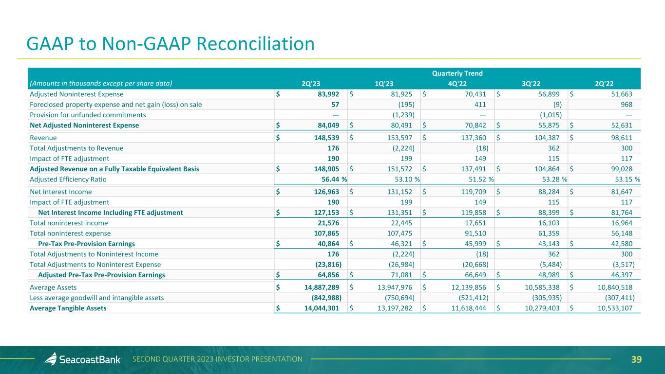 38SECOND QUARTER 2023 INVESTOR PRESENTATION Quarterly Trend (Amounts in thousands except per share data) 2Q'23 1Q'23 4Q'22 3Q'22 2Q'22 Net Income $ 31,249 $ 11,827 $ 23,927 $ 29,237 $ 32,755 Total noninterest income 21,576 22,445 17,651 16,103 16,964 Securities losses/(gains), net 176 (107) (18) 362 300 BOLI benefits on death (included in other income) — (2,117) — — — Total Adjustments to Noninterest Income 176 (2,224) (18) 362 300 Total Adjusted Noninterest Income 21,752 20,221 17,633 16,465 17,264 Total noninterest expense 107,865 107,475 91,510 61,359 56,148 Salaries and wages (1,573) (4,240) (5,680) — (652) Outsourced data processing costs (10,904) (6,551) (2,582) — (420) Legal and professional fees (1,664) (4,789) (6,485) (1,791) (1,381) Other categories (1,507) (1,952) (1,393) (263) (586) Total merger-related charges (15,648) (17,532) (16,140) (2,054) (3,039) Amortization of intangibles (7,654) (6,727) (4,763) (1,446) (1,446) Branch reductions and other expense initiatives (571) (1,291) (176) (960) — Total Adjustments to Noninterest Expense (23,873) (25,550) (21,079) (4,460) (4,485) Total Adjusted Noninterest Expense 83,992 81,925 70,431 56,899 51,663 Income Taxes 10,189 2,697 7,794 9,115 8,886 Tax effect of adjustments 6,095 5,912 5,062 1,222 1,213 Adjusted Income Taxes 16,284 8,609 12,856 10,337 10,099 Adjusted Net Income $ 49,203 $ 29,241 $ 39,926 $ 32,837 $ 36,327 Earnings per diluted share, as reported $ 0.37 $ 0.15 $ 0.34 $ 0.47 $ 0.53 Adjusted Earnings per Diluted Share 0.58 0.36 0.56 0.53 0.59 Average diluted shares outstanding 85,536 80,717 71,374 61,961 61,923 GAAP to Non-GAAP Reconciliation