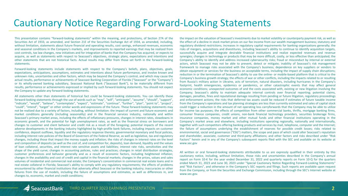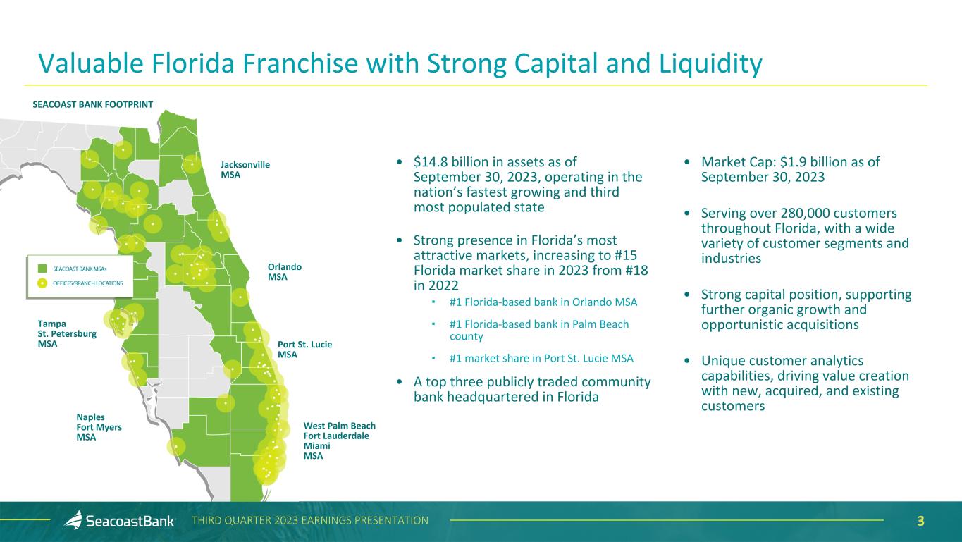 2THIRD QUARTER 2023 EARNINGS PRESENTATION This presentation contains “forward-looking statements” within the meaning, and protections, of Section 27A of the Securities Act of 1933, as amended, and Section 21E of the Securities Exchange Act of 1934, as amended, including, without limitation, statements about future financial and operating results, cost savings, enhanced revenues, economic and seasonal conditions in the Company’s markets, and improvements to reported earnings that may be realized from cost controls, tax law changes, new initiatives and for integration of banks that the Company has acquired, or expects to acquire, as well as statements with respect to Seacoast's objectives, strategic plans, expectations and intentions and other statements that are not historical facts. Actual results may differ from those set forth in the forward-looking statements. Forward-looking statements include statements with respect to the Company’s beliefs, plans, objectives, goals, expectations, anticipations, assumptions, estimates and intentions about future performance, and involve known and unknown risks, uncertainties and other factors, which may be beyond the Company’s control, and which may cause the actual results, performance or achievements of Seacoast Banking Corporation of Florida (“Seacoast” or the “Company”) or its wholly-owned banking subsidiary, Seacoast National Bank (“Seacoast Bank”), to be materially different from results, performance or achievements expressed or implied by such forward-looking statements. You should not expect the Company to update any forward-looking statements. All statements other than statements of historical fact could be forward-looking statements. You can identify these forward-looking statements through the use of words such as "may", "will", "anticipate", "assume", "should", "support", "indicate", "would", "believe", "contemplate", "expect", "estimate", "continue", "further", "plan", "point to", "project", "could", "intend", "target" or other similar words and expressions of the future. These forward-looking statements may not be realized due to a variety of factors, including, without limitation: the impact of current and future economic and market conditions generally (including seasonality) and in the financial services industry, nationally and within Seacoast’s primary market areas, including the effects of inflationary pressures, changes in interest rates, slowdowns in economic growth, and the potential for high unemployment rates, as well as the financial stress on borrowers and changes to customer and client behavior and credit risk as a result of the foregoing; potential impacts of the recent adverse developments in the banking industry highlighted by high-profile bank failures, including impacts on customer confidence, deposit outflows, liquidity and the regulatory response thereto; governmental monetary and fiscal policies, including interest rate policies of the Board of Governors of the Federal Reserve, as well as legislative, tax and regulatory changes, including those that impact the money supply and inflation; the risks of changes in interest rates on the level and composition of deposits (as well as the cost of, and competition for, deposits), loan demand, liquidity and the values of loan collateral, securities, and interest rate sensitive assets and liabilities; interest rate risks, sensitivities and the shape of the yield curve; changes in accounting policies, rules and practices; changes in retail distribution strategies, customer preferences and behavior generally and as a result of economic factors, including heightened inflation; changes in the availability and cost of credit and capital in the financial markets; changes in the prices, values and sales volumes of residential and commercial real estate; the Company’s concentration in commercial real estate loans and in real estate collateral in Florida; Seacoast’s ability to comply with any regulatory requirements; the effects of problems encountered by other financial institutions that adversely affect Seacoast or the banking industry; inaccuracies or other failures from the use of models, including the failure of assumptions and estimates, as well as differences in, and changes to, economic, market and credit conditions; the impact on the valuation of Seacoast’s investments due to market volatility or counterparty payment risk, as well as the effect of a decline in stock market prices on our fee income from our wealth management business; statutory and regulatory dividend restrictions; increases in regulatory capital requirements for banking organizations generally; the risks of mergers, acquisitions and divestitures, including Seacoast’s ability to continue to identify acquisition targets, successfully acquire and integrate desirable financial institutions and realize expected revenues and revenue synergies; changes in technology or products that may be more difficult, costly, or less effective than anticipated; the Company’s ability to identify and address increased cybersecurity risks; fraud or misconduct by internal or external actors, which Seacoast may not be able to prevent, detect or mitigate; inability of Seacoast’s risk management framework to manage risks associated with the Company’s business; dependence on key suppliers or vendors to obtain equipment or services for the business on acceptable terms, including the impact of supply chain disruptions; reduction in or the termination of Seacoast’s ability to use the online- or mobile-based platform that is critical to the Company’s business growth strategy; the effects of war or other conflicts, including the impacts related to or resulting from Russia’s military action in Ukraine, acts of terrorism, natural disasters, including hurricanes in the Company’s footprint, health emergencies, epidemics or pandemics, or other catastrophic events that may affect general economic con