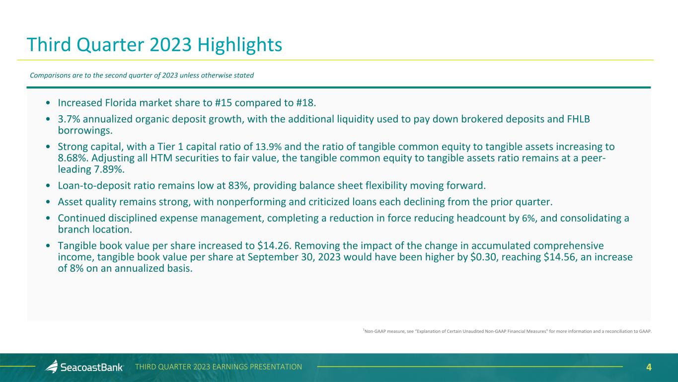 3THIRD QUARTER 2023 EARNINGS PRESENTATION • $14.8 billion in assets as of September 30, 2023, operating in the nation’s fastest growing and third most populated state • Strong presence in Florida’s most attractive markets, increasing to #15 Florida market share in 2023 from #18 in 2022 ▪ #1 Florida-based bank in Orlando MSA ▪ #1 Florida-based bank in Palm Beach county ▪ #1 market share in Port St. Lucie MSA • A top three publicly traded community bank headquartered in Florida • Market Cap: $1.9 billion as of September 30, 2023 • Serving over 280,000 customers throughout Florida, with a wide variety of customer segments and industries • Strong capital position, supporting further organic growth and opportunistic acquisitions • Unique customer analytics capabilities, driving value creation with new, acquired, and existing customers Jacksonville MSA West Palm Beach Fort Lauderdale Miami MSA Port St. Lucie MSA Orlando MSA Tampa St. Petersburg MSA Naples Fort Myers MSA Valuable Florida Franchise with Strong Capital and Liquidity SEACOAST BANK FOOTPRINT
