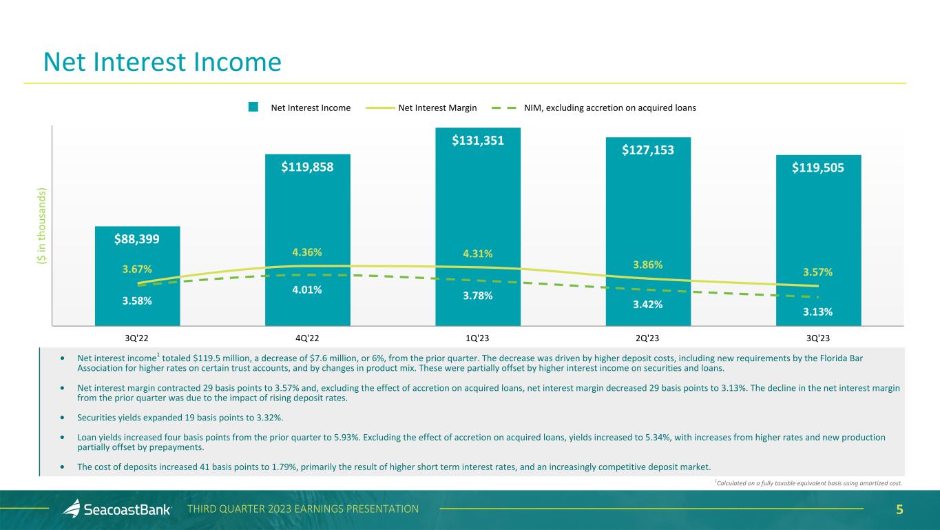 4THIRD QUARTER 2023 EARNINGS PRESENTATION • Increased Florida market share to #15 compared to #18. • 3.7% annualized organic deposit growth, with the additional liquidity used to pay down brokered deposits and FHLB borrowings. • Strong capital, with a Tier 1 capital ratio of 13.9% and the ratio of tangible common equity to tangible assets increasing to 8.68%. Adjusting all HTM securities to fair value, the tangible common equity to tangible assets ratio remains at a peer- leading 7.89%. • Loan-to-deposit ratio remains low at 83%, providing balance sheet flexibility moving forward. • Asset quality remains strong, with nonperforming and criticized loans each declining from the prior quarter. • Continued disciplined expense management, completing a reduction in force reducing headcount by 6%, and consolidating a branch location. • Tangible book value per share increased to $14.26. Removing the impact of the change in accumulated comprehensive income, tangible book value per share at September 30, 2023 would have been higher by $0.30, reaching $14.56, an increase of 8% on an annualized basis. Third Quarter 2023 Highlights 1Non-GAAP measure, see “Explanation of Certain Unaudited Non-GAAP Financial Measures" for more information and a reconciliation to GAAP. Comparisons are to the second quarter of 2023 unless otherwise stated