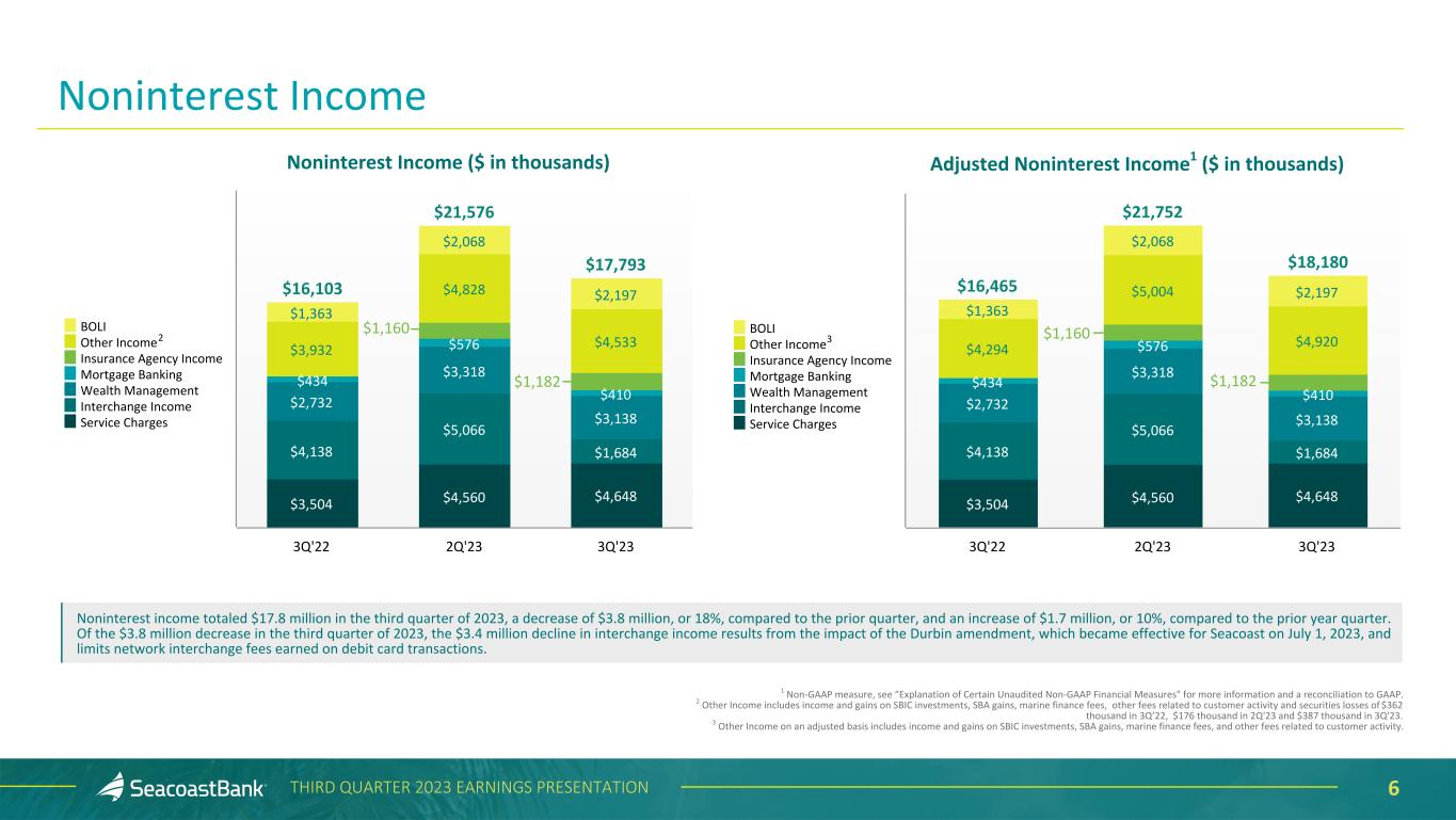 5THIRD QUARTER 2023 EARNINGS PRESENTATION Net Interest Income ($ in th ou sa nd s) $88,399 $119,858 $131,351 $127,153 $119,505 3.67% 4.36% 4.31% 3.86% 3.57% 3.58% 4.01% 3.78% 3.42% 3.13% Net Interest Income Net Interest Margin NIM, excluding accretion on acquired loans 3Q'22 4Q'22 1Q'23 2Q'23 3Q'23 • Net interest income1 totaled $119.5 million, a decrease of $7.6 million, or 6%, from the prior quarter. The decrease was driven by higher deposit costs, including new requirements by the Florida Bar Association for higher rates on certain trust accounts, and by changes in product mix. These were partially offset by higher interest income on securities and loans. • Net interest margin contracted 29 basis points to 3.57% and, excluding the effect of accretion on acquired loans, net interest margin decreased 29 basis points to 3.13%. The decline in the net interest margin from the prior quarter was due to the impact of rising deposit rates. • Securities yields expanded 19 basis points to 3.32%. • Loan yields increased four basis points from the prior quarter to 5.93%. Excluding the effect of accretion on acquired loans, yields increased to 5.34%, with increases from higher rates and new production partially offset by prepayments. • The cost of deposits increased 41 basis points to 1.79%, primarily the result of higher short term interest rates, and an increasingly competitive deposit market. 1Calculated on a fully taxable equivalent basis using amortized cost.