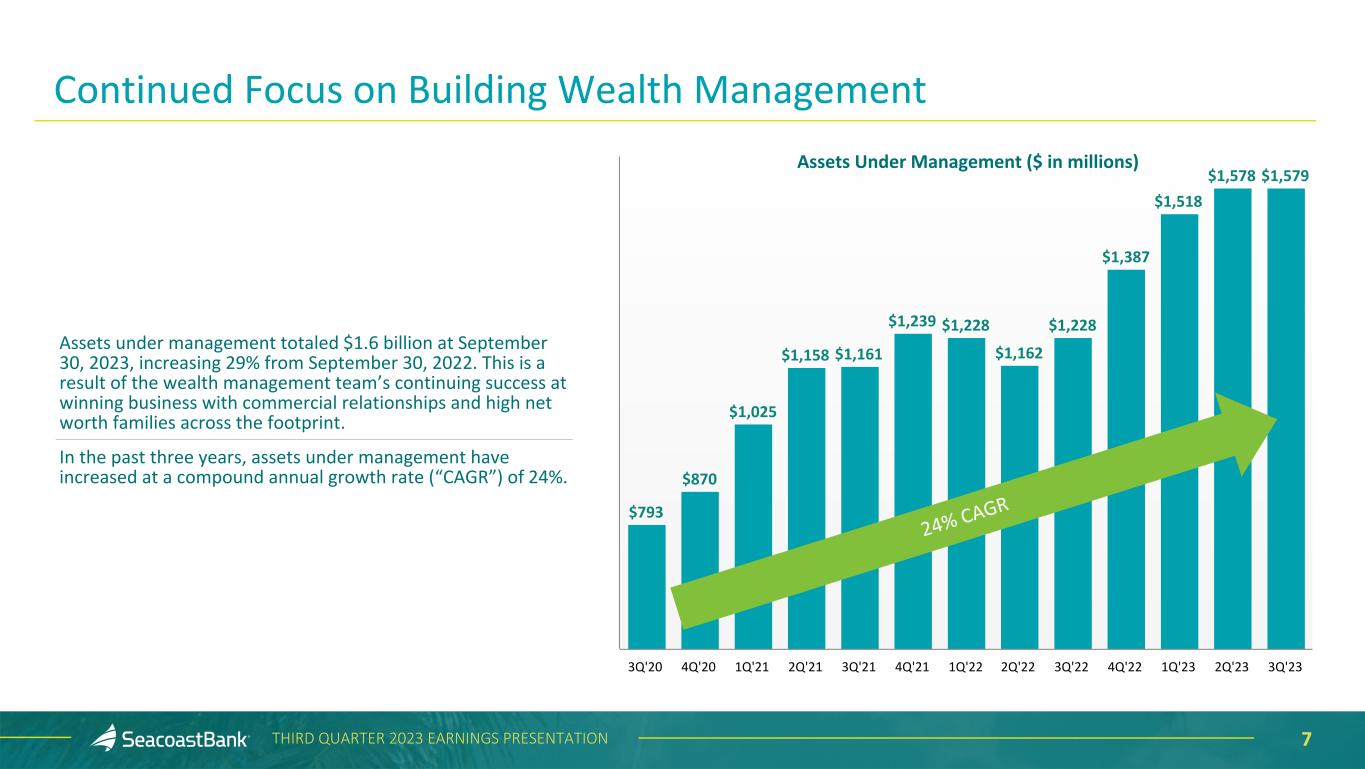 6THIRD QUARTER 2023 EARNINGS PRESENTATION $16,103 $21,576 $17,793 $3,504 $4,560 $4,648 $4,138 $5,066 $1,684 $2,732 $3,318 $3,138 $434 $576 $410 $3,932 $4,828 $4,533 $1,363 $2,068 $2,197 BOLI Other Income Insurance Agency Income Mortgage Banking Wealth Management Interchange Income Service Charges 3Q'22 2Q'23 3Q'23 $16,465 $21,752 $18,180 $3,504 $4,560 $4,648 $4,138 $5,066 $1,684 $2,732 $3,318 $3,138 $434 $576 $410 $4,294 $5,004 $4,920 $1,363 $2,068 $2,197 BOLI Other Income Insurance Agency Income Mortgage Banking Wealth Management Interchange Income Service Charges 3Q'22 2Q'23 3Q'23 Adjusted Noninterest Income1 ($ in thousands) 2 3 Noninterest Income ($ in thousands) 1 Non-GAAP measure, see “Explanation of Certain Unaudited Non-GAAP Financial Measures" for more information and a reconciliation to GAAP. 2 Other Income includes income and gains on SBIC investments, SBA gains, marine finance fees, other fees related to customer activity and securities losses of $362 thousand in 3Q’22, $176 thousand in 2Q'23 and $387 thousand in 3Q'23. 3 Other Income on an adjusted basis includes income and gains on SBIC investments, SBA gains, marine finance fees, and other fees related to customer activity. Noninterest Income Noninterest income totaled $17.8 million in the third quarter of 2023, a decrease of $3.8 million, or 18%, compared to the prior quarter, and an increase of $1.7 million, or 10%, compared to the prior year quarter. Of the $3.8 million decrease in the third quarter of 2023, the $3.4 million decline in interchange income results from the impact of the Durbin amendment, which became effective for Seacoast on July 1, 2023, and limits network interchange fees earned on debit card transactions. $1,160 $1,160 $1,182 $1,182
