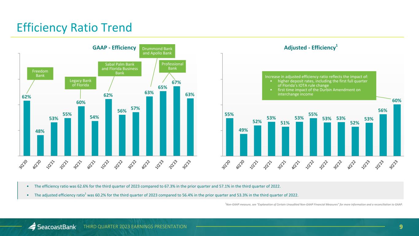 8THIRD QUARTER 2023 EARNINGS PRESENTATION $56,899 $83,992 $83,153 $32,488 $50,511 $50,379$5,598 $9,318 $8,778 $6,518 $9,911 $9,724 $2,003 $2,397 $2,773 $9,532 $9,739 $9,241 Other Expense Legal & Professional Occupancy & Telephone FDIC Assessment Data Processing Cost Salaries & Benefits 3Q'22 2Q'23 3Q'23 $61,359 $107,865 $93,915 $32,494 $52,627 $53,637$1,446 $7,654 $7,457 $5,393 $20,222 $8,714 $7,481 $10,928 $9,810 $3,794 $4,062 $2,679 $9,991 $10,256 $9,360 Other Expense Legal & Professional Occupancy & Telephone FDIC Assessment Data Processing Cost Amortization of Intangibles Salaries & Benefits 3Q'22 2Q'23 3Q'23 Adjusted Noninterest Expense1 ($ in thousands) 2 2 Noninterest Expense ($ in thousands) Noninterest expense decreased $14.0 million on a GAAP basis and decreased $0.8 million on an adjusted basis. Changes quarter-over-quarter on an adjusted basis include: • Salaries and benefits decreased $0.1 million to $50.4 million in the third quarter of 2023, reflecting lower base salaries expense partially offset by lower service origination fees attributed to lower loan production. • Data processing cost decreased $0.5 million to $8.8 million in the third quarter of 2023 reflecting the benefits of acquisition-related system integration. • Occupancy and telephone decreased $0.2 million to $9.7 million in the third quarter of 2023 reflecting branch consolidation and cost synergies from recent acquisitions, including one additional branch consolidation in July. • Legal and professional fees increased by $0.4 million to $2.8 million in the third quarter of 2023, reflecting the impact of one-time projects during the third quarter. • Other expense decreased $0.5 million to $9.2 million in the third quarter of 2023, reflecting the benefit of acquisition-related cost synergies. 1Non-GAAP measure, see “Explanation of Certain Unaudited Non-GAAP Financial Measures" for more information and a reconciliation to GAAP. 2Other Expense includes marketing expenses, provision for unfunded commitments, foreclosed property expense and net loss/(gain) on sale and other expenses associated with ongoing business operations. Noninterest Expense $2,116 $2,116 $760 $760 $2,258 $2,258