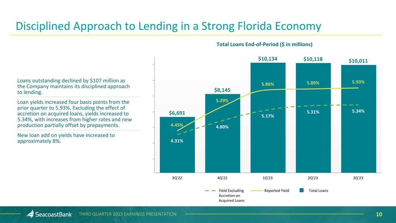 9THIRD QUARTER 2023 EARNINGS PRESENTATION 62% 48% 53% 55% 60% 54% 62% 56% 57% 63% 65% 67% 63% 3Q '20 4Q '20 1Q '21 2Q '21 3Q '21 4Q '21 1Q '22 2Q '22 3Q '22 4Q '22 1Q '23 2Q '23 3Q '23 Efficiency Ratio Trend 55% 49% 52% 53% 51% 53% 55% 53% 53% 52% 53% 56% 60% 3Q '20 4Q '20 1Q '21 2Q '21 3Q '21 4Q '21 1Q '22 2Q '22 3Q '22 4Q '22 1Q '23 2Q '23 3Q '23 GAAP - Efficiency Adjusted - Efficiency1 • The efficiency ratio was 62.6% for the third quarter of 2023 compared to 67.3% in the prior quarter and 57.1% in the third quarter of 2022. • The adjusted efficiency ratio1 was 60.2% for the third quarter of 2023 compared to 56.4% in the prior quarter and 53.3% in the third quarter of 2022. 1Non-GAAP measure, see “Explanation of Certain Unaudited Non-GAAP Financial Measures" for more information and a reconciliation to GAAP. Freedom Bank Legacy Bank of Florida Sabal Palm Bank and Florida Business Bank Drummond Bank and Apollo Bank Professional Bank Increase in adjusted efficiency ratio reflects the impact of: • higher deposit rates, including the first full quarter of Florida’s IOTA rule change • first time impact of the Durbin Amendment on interchange income