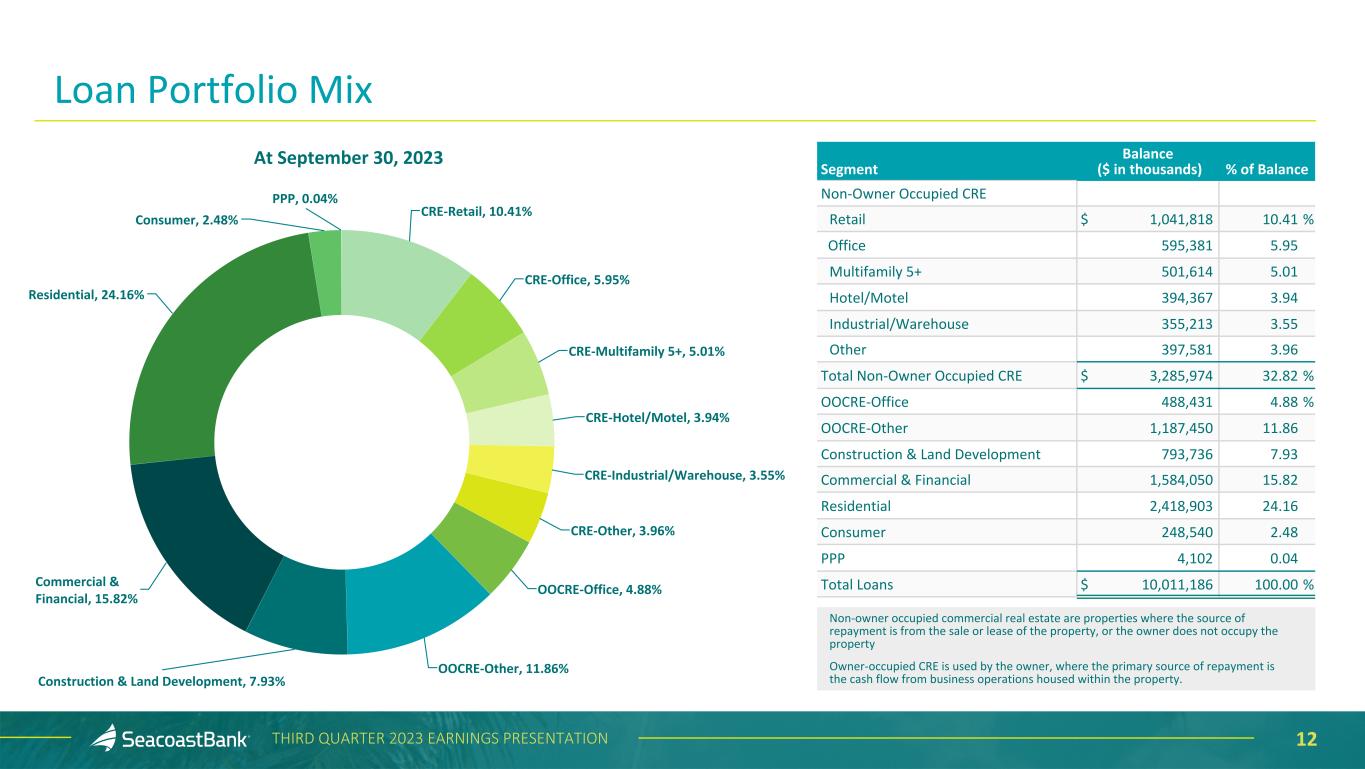 11THIRD QUARTER 2023 EARNINGS PRESENTATION Commercial Real Estate - Owner Occupied $1,675,881 17% Construction and Land Development $793,736 8% Consumer $248,540 2% Commercial & Financial $1,584,050 16% Commercial Real Estate - Non-Owner Occupied $3,285,974 33% Residential Real Estate $2,418,903 24% At September 30, 2023 ($ in thousands) Seacoast's Lending Strategy Sustains a Diverse Loan Portfolio The Company remains focused and committed to its strict credit underwriting standards. Construction and land development and commercial real estate loans, as defined in regulatory guidance, represent 48% and 234%, respectively, of total consolidated risk based capital. Seacoast’s average loan size is $306 thousand and the average commercial loan size is $683 thousand. Portfolio diversification in terms of asset mix, industry, and loan type, has been a critical element of the Company’s lending strategy. Exposure across industries and collateral types are broadly distributed. Construction & Land Development and CRE Loans to Total Risk Based Capital 276% 234% 64% 48% CRE Construction & Land Development Peers SBCF Peer Source: 2Q’23 S&P Capital Paycheck Protection Program $4,102 <1%