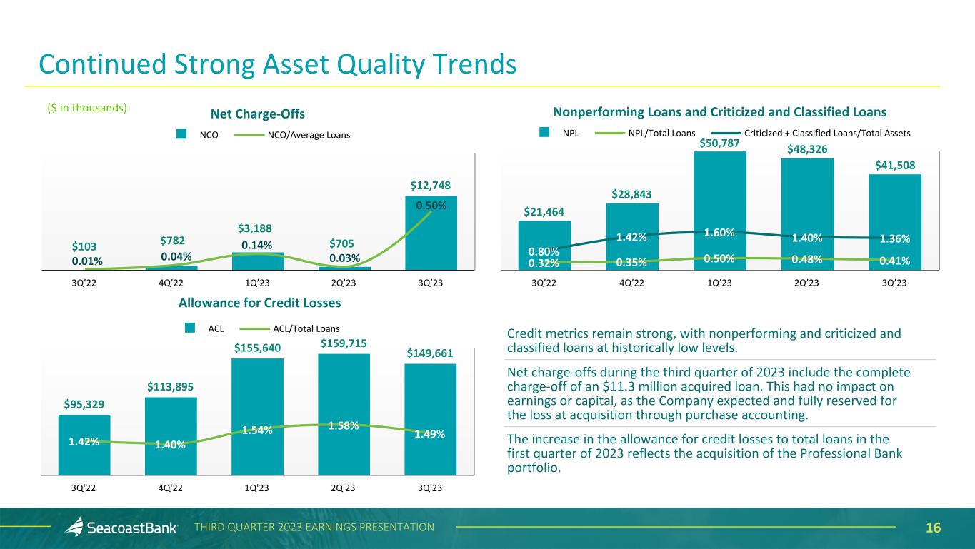 15THIRD QUARTER 2023 EARNINGS PRESENTATION Allowance for Credit Losses and Purchase Discount ($ in thousands) Loans Outstanding Allowance for Credit Losses % of Category Purchase Discount % of Category Construction and Land Development $ 793,736 $ 7,685 0.97 % $ 10,235 1.29 % Owner Occupied Commercial Real Estate 1,675,881 6,065 0.36 28,614 1.71 Commercial Real Estate 3,285,974 52,441 1.60 85,251 2.59 Residential Real Estate 2,418,903 38,735 1.60 34,027 1.41 Commercial & Financial 1,584,050 31,525 1.99 24,830 1.57 Consumer 248,540 13,210 5.32 3,498 1.41 Total Excluding PPP $ 10,007,084 $ 149,661 1.50 % $ 186,455 1.86 % Paycheck Protection Program $ 4,102 $ — — % $ — — % Total $ 10,011,186 $ 149,661 1.49 % $ 186,455 1.86 % The total allowance for credit losses of $149.7 million as of September 30, 2023, represents management’s estimate of lifetime expected credit losses. Combined with the $186.5 million remaining unrecognized discount on acquired loans, a total of $336.1 million, or 3.4%, of total loans is available to cover potential losses. As acquired loans are repaid, the unrecognized discount is earned as an adjustment to yield over the life of the loans. Additionally, a reserve for potential credit losses on lending-related commitments of $4.7 million is reflected within Other Liabilities.