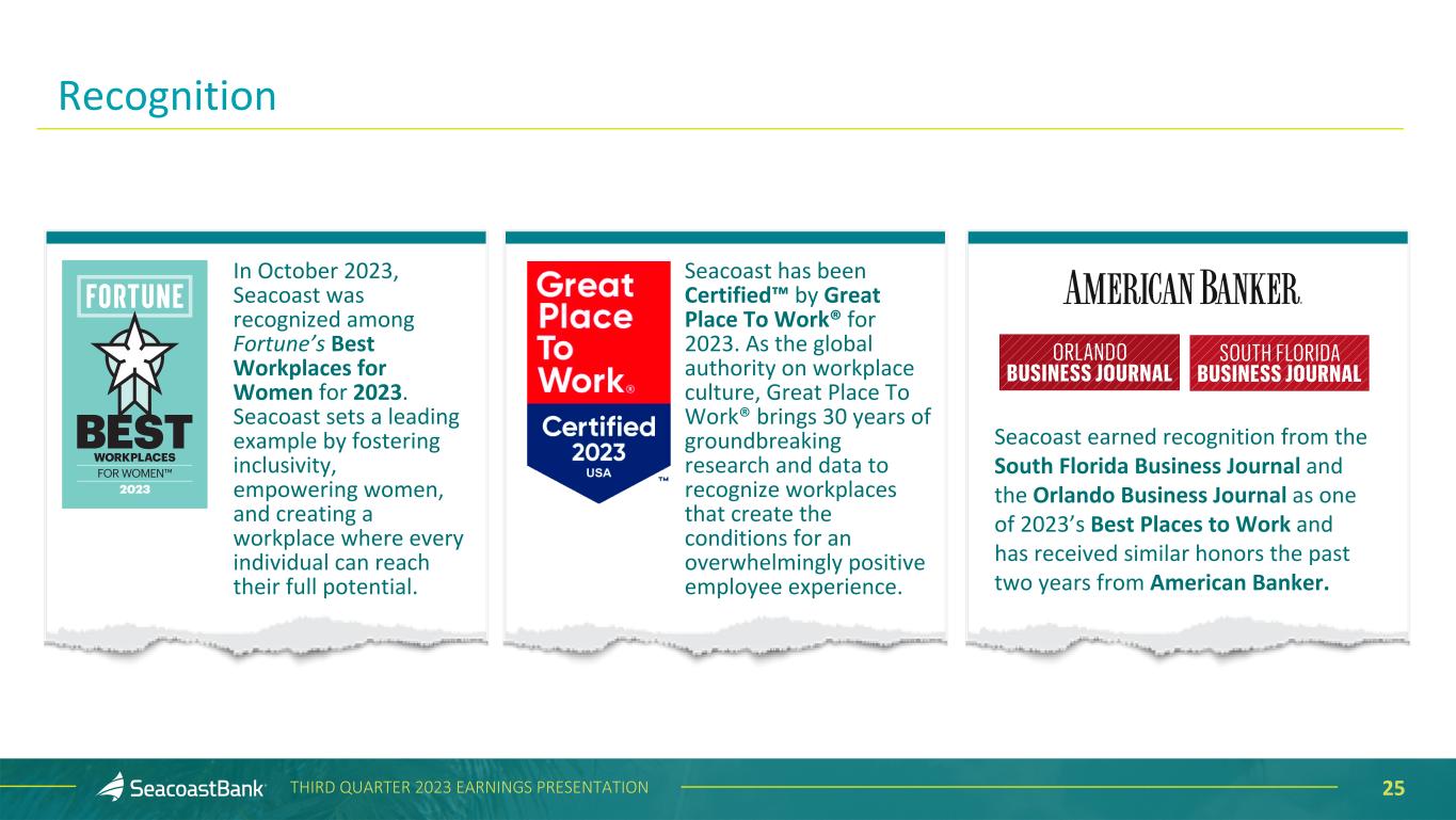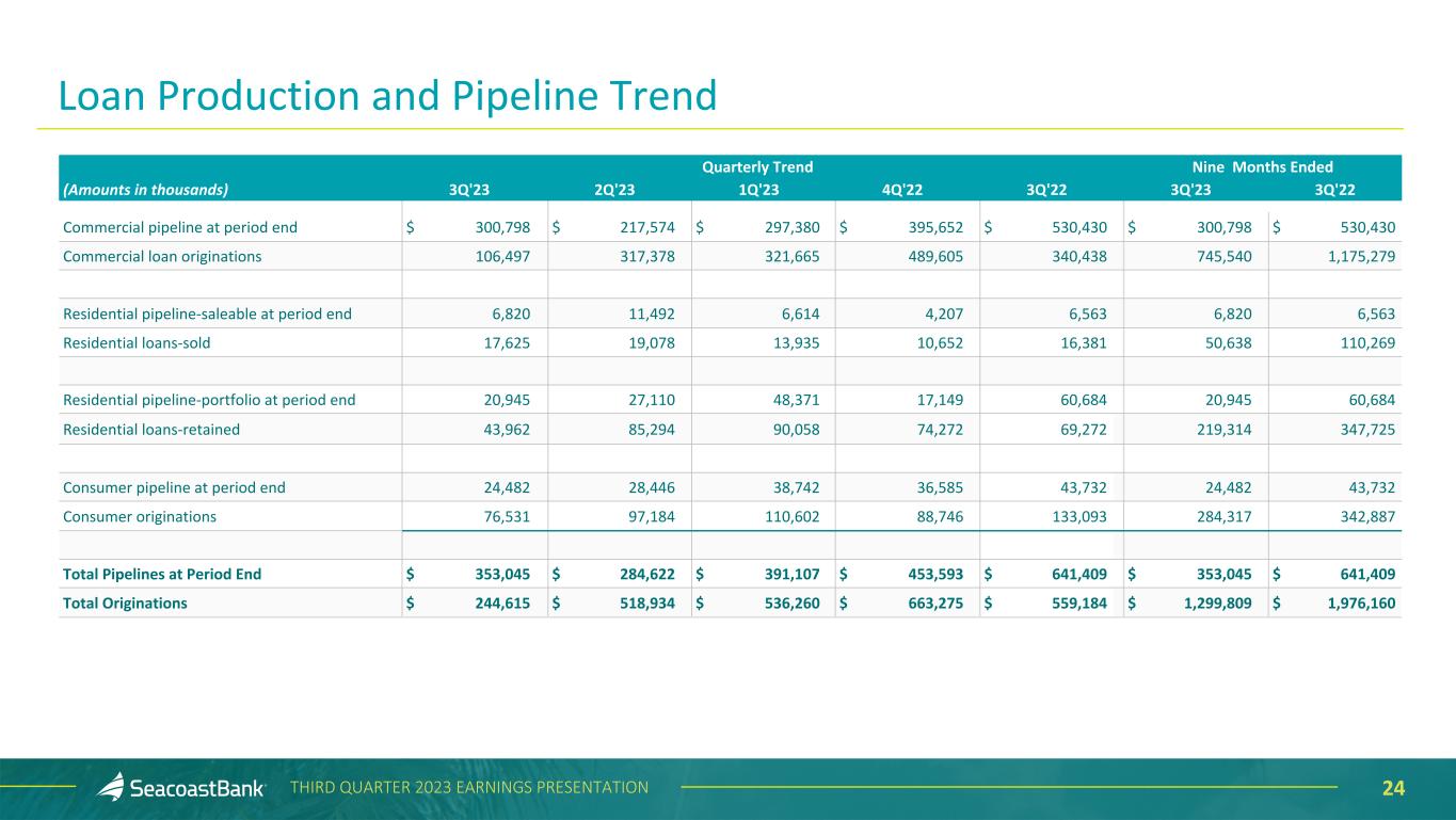24THIRD QUARTER 2023 EARNINGS PRESENTATION Quarterly Trend Nine Months Ended (Amounts in thousands) 3Q'23 2Q'23 1Q'23 4Q'22 3Q'22 3Q'23 3Q'22 Commercial pipeline at period end $ 300,798 $ 217,574 $ 297,380 $ 395,652 $ 530,430 $ 300,798 $ 530,430 Commercial loan originations 106,497 317,378 321,665 489,605 340,438 745,540 1,175,279 Residential pipeline-saleable at period end 6,820 11,492 6,614 4,207 6,563 6,820 6,563 Residential loans-sold 17,625 19,078 13,935 10,652 16,381 50,638 110,269 Residential pipeline-portfolio at period end 20,945 27,110 48,371 17,149 60,684 20,945 60,684 Residential loans-retained 43,962 85,294 90,058 74,272 69,272 219,314 347,725 Consumer pipeline at period end 24,482 28,446 38,742 36,585 43,732 24,482 43,732 Consumer originations 76,531 97,184 110,602 88,746 133,093 284,317 342,887 Total Pipelines at Period End $ 353,045 $ 284,622 $ 391,107 $ 453,593 $ 641,409 $ 353,045 $ 641,409 Total Originations $ 244,615 $ 518,934 $ 536,260 $ 663,275 $ 559,184 $ 1,299,809 $ 1,976,160 Loan Production and Pipeline Trend