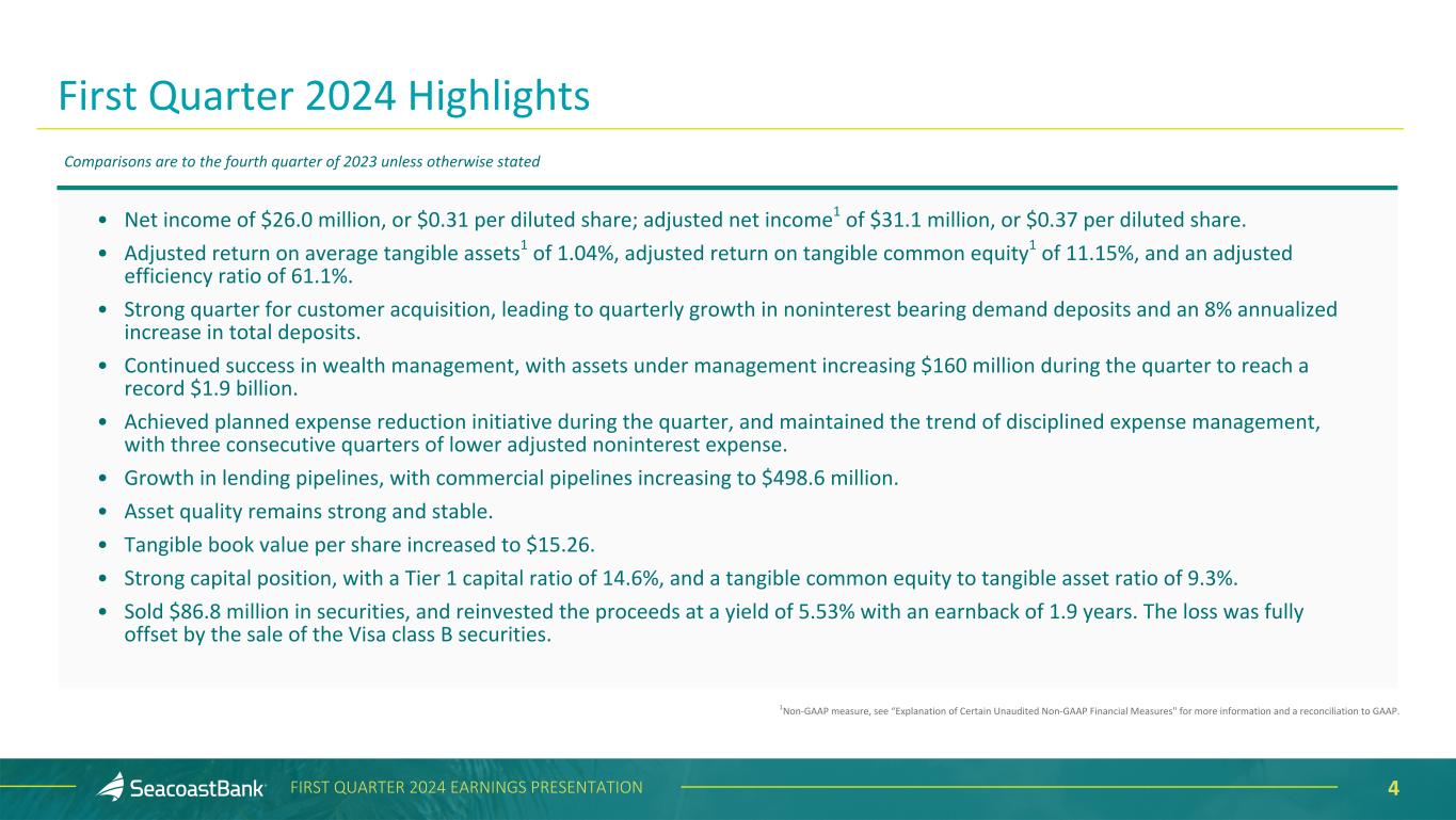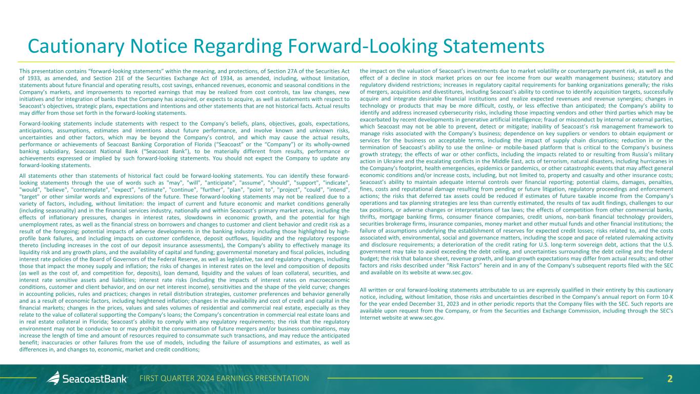 2FIRST QUARTER 2024 EARNINGS PRESENTATION Cautionary Notice Regarding Forward-Looking Statements This presentation contains “forward-looking statements” within the meaning, and protections, of Section 27A of the Securities Act of 1933, as amended, and Section 21E of the Securities Exchange Act of 1934, as amended, including, without limitation, statements about future financial and operating results, cost savings, enhanced revenues, economic and seasonal conditions in the Company’s markets, and improvements to reported earnings that may be realized from cost controls, tax law changes, new initiatives and for integration of banks that the Company has acquired, or expects to acquire, as well as statements with respect to Seacoast's objectives, strategic plans, expectations and intentions and other statements that are not historical facts. Actual results may differ from those set forth in the forward-looking statements. Forward-looking statements include statements with respect to the Company’s beliefs, plans, objectives, goals, expectations, anticipations, assumptions, estimates and intentions about future performance, and involve known and unknown risks, uncertainties and other factors, which may be beyond the Company’s control, and which may cause the actual results, performance or achievements of Seacoast Banking Corporation of Florida (“Seacoast” or the “Company”) or its wholly-owned banking subsidiary, Seacoast National Bank (“Seacoast Bank”), to be materially different from results, performance or achievements expressed or implied by such forward-looking statements. You should not expect the Company to update any forward-looking statements. All statements other than statements of historical fact could be forward-looking statements. You can identify these forward- looking statements through the use of words such as "may", "will", "anticipate", "assume", "should", "support", "indicate", "would", "believe", "contemplate", "expect", "estimate", "continue", "further", "plan", "point to", "project", "could", "intend", "target" or other similar words and expressions of the future. These forward-looking statements may not be realized due to a variety of factors, including, without limitation: the impact of current and future economic and market conditions generally (including seasonality) and in the financial services industry, nationally and within Seacoast’s primary market areas, including the effects of inflationary pressures, changes in interest rates, slowdowns in economic growth, and the potential for high unemployment rates, as well as the financial stress on borrowers and changes to customer and client behavior and credit risk as a result of the foregoing; potential impacts of adverse developments in the banking industry including those highlighted by high- profile bank failures, and including impacts on customer confidence, deposit outflows, liquidity and the regulatory response thereto (including increases in the cost of our deposit insurance assessments), the Company's ability to effectively manage its liquidity risk and any growth plans, and the availability of capital and funding; governmental monetary and fiscal policies, including interest rate policies of the Board of Governors of the Federal Reserve, as well as legislative, tax and regulatory changes, including those that impact the money supply and inflation; the risks of changes in interest rates on the level and composition of deposits (as well as the cost of, and competition for, deposits), loan demand, liquidity and the values of loan collateral, securities, and interest rate sensitive assets and liabilities; interest rate risks (including the impacts of interest rates on macroeconomic conditions, customer and client behavior, and on our net interest income), sensitivities and the shape of the yield curve; changes in accounting policies, rules and practices; changes in retail distribution strategies, customer preferences and behavior generally and as a result of economic factors, including heightened inflation; changes in the availability and cost of credit and capital in the financial markets; changes in the prices, values and sales volumes of residential and commercial real estate, especially as they relate to the value of collateral supporting the Company’s loans; the Company’s concentration in commercial real estate loans and in real estate collateral in Florida; Seacoast’s ability to comply with any regulatory requirements; the risk that the regulatory environment may not be conducive to or may prohibit the consummation of future mergers and/or business combinations, may increase the length of time and amount of resources required to consummate such transactions, and may reduce the anticipated benefit; inaccuracies or other failures from the use of models, including the failure of assumptions and estimates, as well as differences in, and changes to, economic, market and credit conditions; the impact on the valuation of Seacoast’s investments due to market volatility or counterparty payment risk, as well as the effect of a decline in stock market prices on our fee income from our wealth management business; statutory and regulatory dividend restrictions; increases in regulatory capital requirements for banking organizations generally; the risks of mergers, acquisitions and divestitures, including Seacoast’s ability to continue to identify acquisition targets, successfully acquire and integrate desirable financial institutions and realize expected revenues and revenue synergies; changes in technology or products that may be more difficult, costly, or less effective than anticipated; the Company’s ability to identify and address increased cybersecurity risks, including those impacting vendors and other third parties which may be exacerbated by recent developments in generative artificial intelligence; fraud or misconduct by internal or external parties, which Seacoast may not be abl
