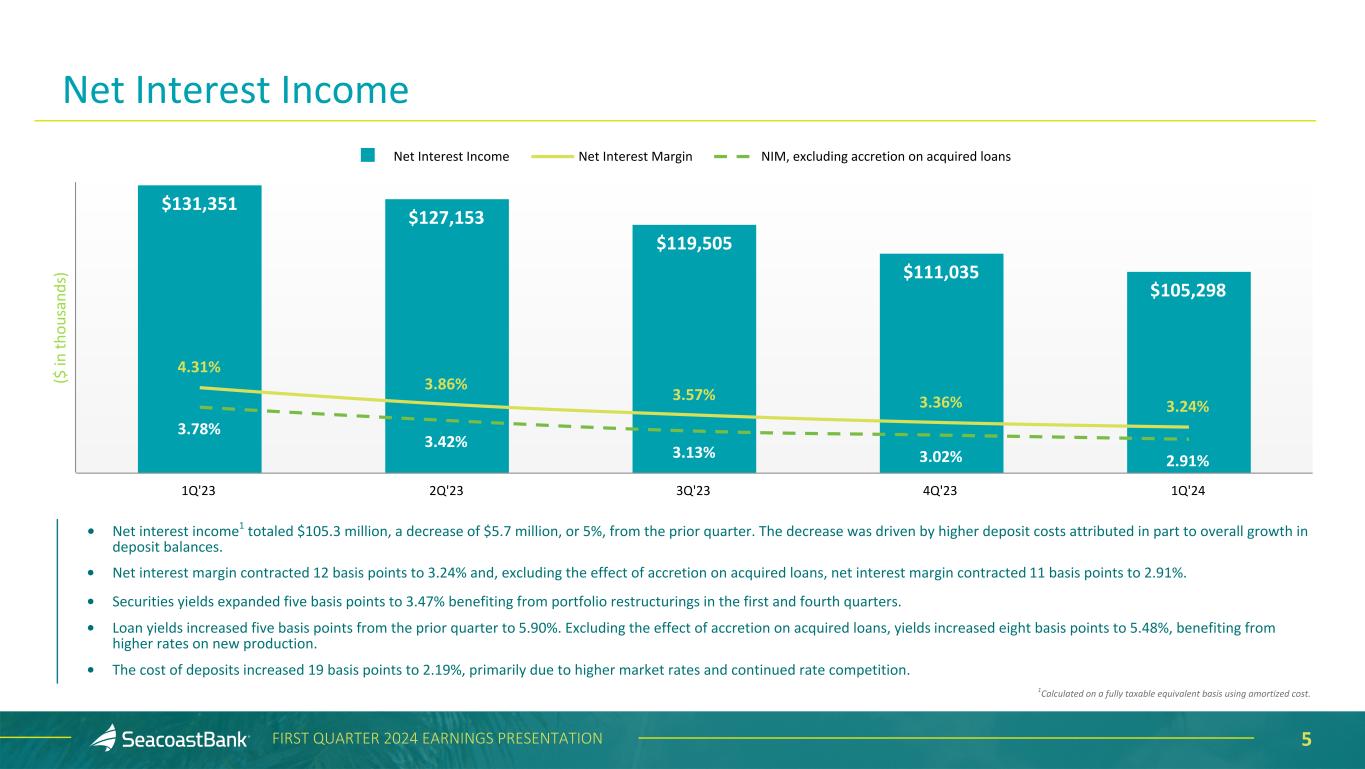 4FIRST QUARTER 2024 EARNINGS PRESENTATION • Net income of $26.0 million, or $0.31 per diluted share; adjusted net income1 of $31.1 million, or $0.37 per diluted share. • Adjusted return on average tangible assets1 of 1.04%, adjusted return on tangible common equity1 of 11.15%, and an adjusted efficiency ratio of 61.1%. • Strong quarter for customer acquisition, leading to quarterly growth in noninterest bearing demand deposits and an 8% annualized increase in total deposits. • Continued success in wealth management, with assets under management increasing $160 million during the quarter to reach a record $1.9 billion. • Achieved planned expense reduction initiative during the quarter, and maintained the trend of disciplined expense management, with three consecutive quarters of lower adjusted noninterest expense. • Growth in lending pipelines, with commercial pipelines increasing to $498.6 million. • Asset quality remains strong and stable. • Tangible book value per share increased to $15.26. • Strong capital position, with a Tier 1 capital ratio of 14.6%, and a tangible common equity to tangible asset ratio of 9.3%. • Sold $86.8 million in securities, and reinvested the proceeds at a yield of 5.53% with an earnback of 1.9 years. The loss was fully offset by the sale of the Visa class B securities. First Quarter 2024 Highlights 1Non-GAAP measure, see “Explanation of Certain Unaudited Non-GAAP Financial Measures" for more information and a reconciliation to GAAP. Comparisons are to the fourth quarter of 2023 unless otherwise stated