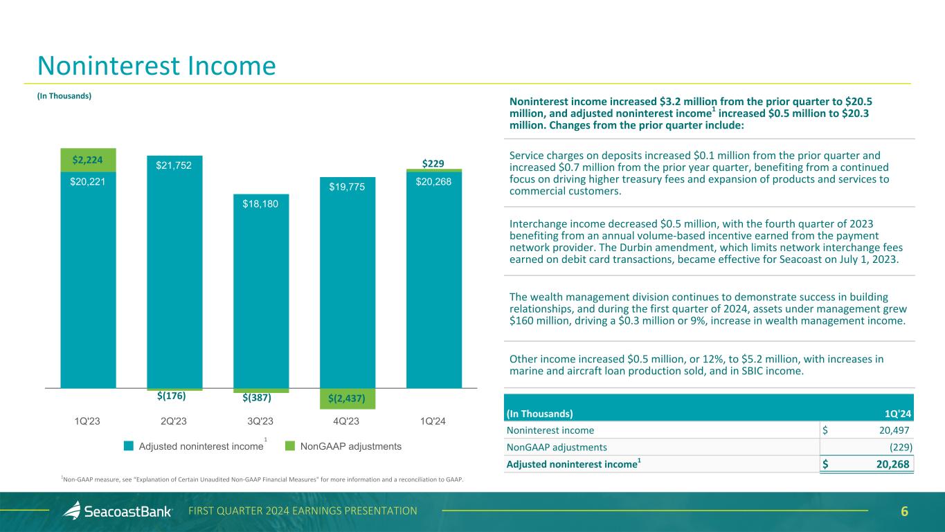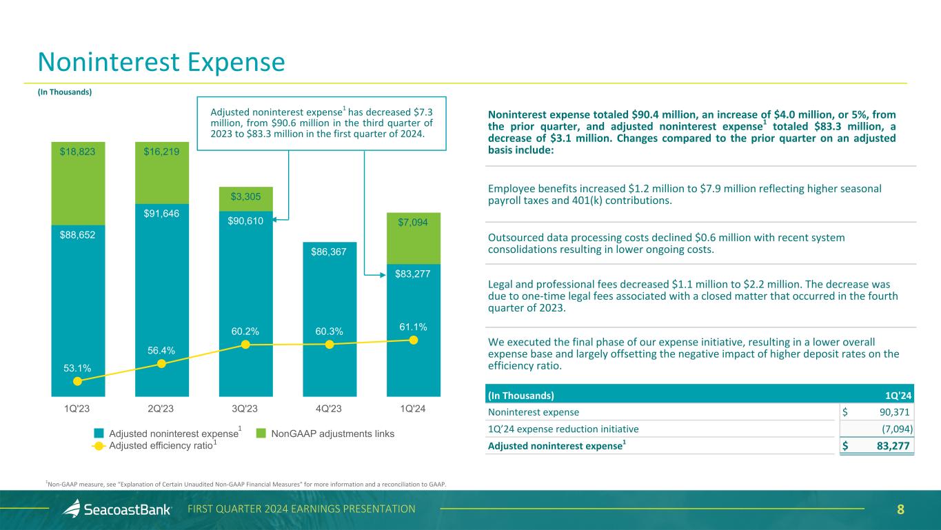 6FIRST QUARTER 2024 EARNINGS PRESENTATION Noninterest income increased $3.2 million from the prior quarter to $20.5 million, and adjusted noninterest income1 increased $0.5 million to $20.3 million. Changes from the prior quarter include: Service charges on deposits increased $0.1 million from the prior quarter and increased $0.7 million from the prior year quarter, benefiting from a continued focus on driving higher treasury fees and expansion of products and services to commercial customers. Interchange income decreased $0.5 million, with the fourth quarter of 2023 benefiting from an annual volume-based incentive earned from the payment network provider. The Durbin amendment, which limits network interchange fees earned on debit card transactions, became effective for Seacoast on July 1, 2023. The wealth management division continues to demonstrate success in building relationships, and during the first quarter of 2024, assets under management grew $160 million, driving a $0.3 million or 9%, increase in wealth management income. Other income increased $0.5 million, or 12%, to $5.2 million, with increases in marine and aircraft loan production sold, and in SBIC income. 1Non-GAAP measure, see “Explanation of Certain Unaudited Non-GAAP Financial Measures" for more information and a reconciliation to GAAP. Noninterest Income $20,221 $21,752 $18,180 $19,775 $20,268 Adjusted noninterest income NonGAAP adjustments 1Q'23 2Q'23 3Q'23 4Q'23 1Q'24 (In Thousands) 1 (In Thousands) 1Q'24 Noninterest income $ 20,497 NonGAAP adjustments (229) Adjusted noninterest income1 $ 20,268 $229 $(176) $(387) $(2,437) $2,224