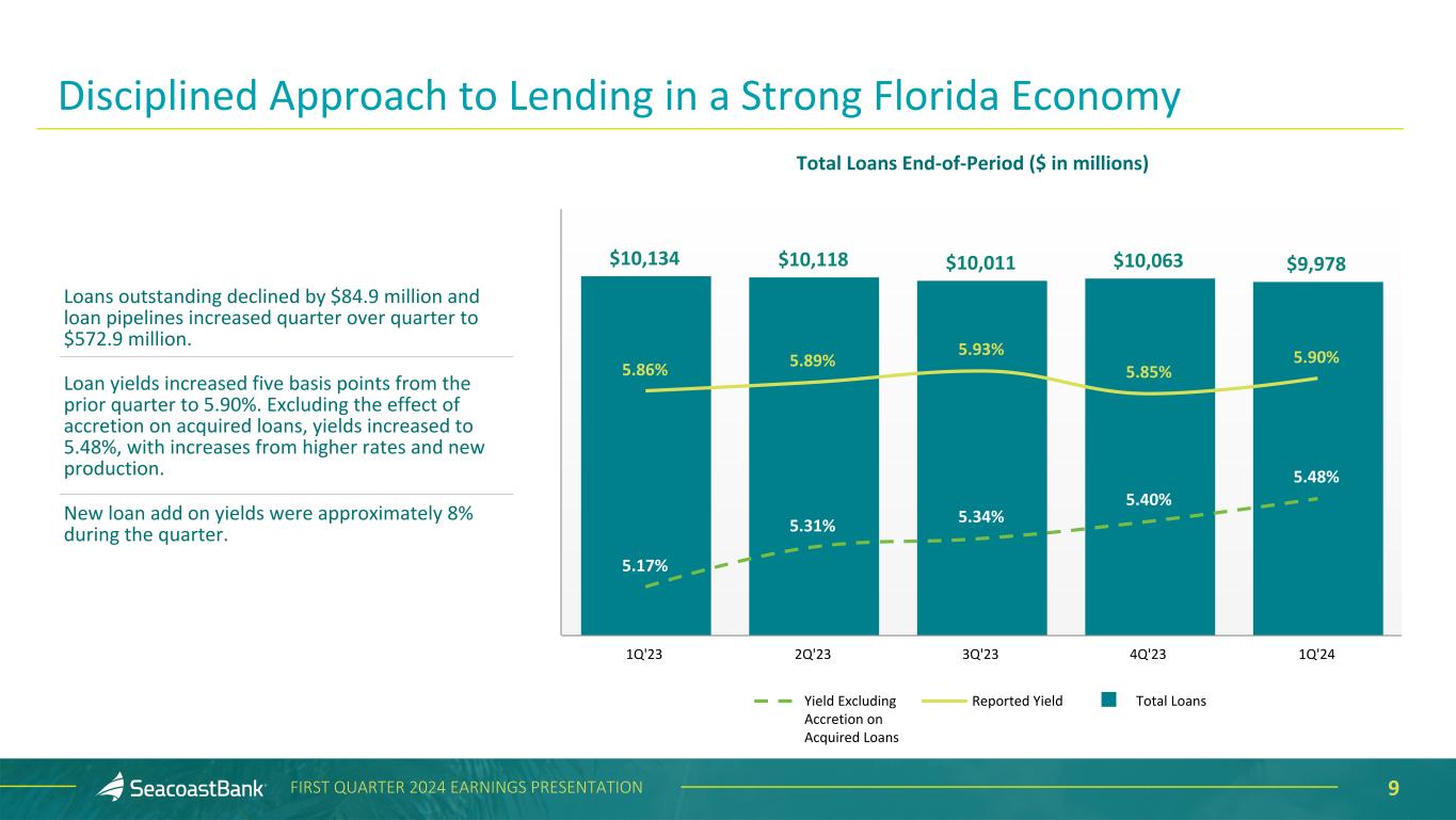 9FIRST QUARTER 2024 EARNINGS PRESENTATION $10,134 $10,118 $10,011 $10,063 $9,978 5.86% 5.89% 5.93% 5.85% 5.90% 5.17% 5.31% 5.34% 5.40% 5.48% Yield Excluding Accretion on Acquired Loans Reported Yield Total Loans 1Q'23 2Q'23 3Q'23 4Q'23 1Q'24 Total Loans End-of-Period ($ in millions) Disciplined Approach to Lending in a Strong Florida Economy Loans outstanding declined by $84.9 million and loan pipelines increased quarter over quarter to $572.9 million. Loan yields increased five basis points from the prior quarter to 5.90%. Excluding the effect of accretion on acquired loans, yields increased to 5.48%, with increases from higher rates and new production. New loan add on yields were approximately 8% during the quarter.