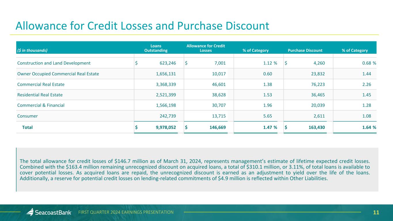 10FIRST QUARTER 2024 EARNINGS PRESENTATION At March 31, 2024 Loan Portfolio Mix Seacoast's lending strategy results in a diverse and granular loan portfolio. Seacoast’s average loan size is $332 thousand and the average commercial loan size is $742 thousand. Portfolio diversification in terms of asset mix, industry, and loan type, has been a critical element of the Company’s lending strategy. Exposures across industries and collateral types are broadly distributed. Construction and land development and commercial real estate loans, as defined in regulatory guidance, represent 36% and 222%, respectively, of total consolidated risk based capital. CRE-Retail, 11.2% CRE-Office, 5.7% CRE-Multifamily 5+, 3.7% CRE-Hotel/Motel, 3.6% CRE-Industrial/Warehouse, 3.7% CRE-Other, 5.9% OOCRE-Office, 4.7% OOCRE-Other, 11.9% Construction & Land Development, 6.2% Commercial & Financial, 15.7% Residential, 25.3% Consumer, 2.4% Construction & Land Development and CRE Loans to Total Risk Based Capital 281% 222% 65% 36% CRE Construction & Land Development Peers SBCF Peer Source: 4Q’23 S&P Capital