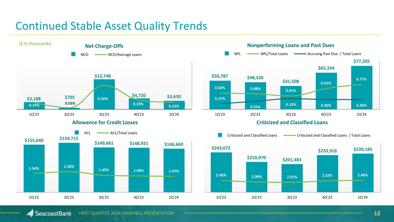11FIRST QUARTER 2024 EARNINGS PRESENTATION Allowance for Credit Losses and Purchase Discount ($ in thousands) Loans Outstanding Allowance for Credit Losses % of Category Purchase Discount % of Category Construction and Land Development $ 623,246 $ 7,001 1.12 % $ 4,260 0.68 % Owner Occupied Commercial Real Estate 1,656,131 10,017 0.60 23,832 1.44 Commercial Real Estate 3,368,339 46,601 1.38 76,223 2.26 Residential Real Estate 2,521,399 38,628 1.53 36,465 1.45 Commercial & Financial 1,566,198 30,707 1.96 20,039 1.28 Consumer 242,739 13,715 5.65 2,611 1.08 Total $ 9,978,052 $ 146,669 1.47 % $ 163,430 1.64 % The total allowance for credit losses of $146.7 million as of March 31, 2024, represents management’s estimate of lifetime expected credit losses. Combined with the $163.4 million remaining unrecognized discount on acquired loans, a total of $310.1 million, or 3.11%, of total loans is available to cover potential losses. As acquired loans are repaid, the unrecognized discount is earned as an adjustment to yield over the life of the loans. Additionally, a reserve for potential credit losses on lending-related commitments of $4.9 million is reflected within Other Liabilities.