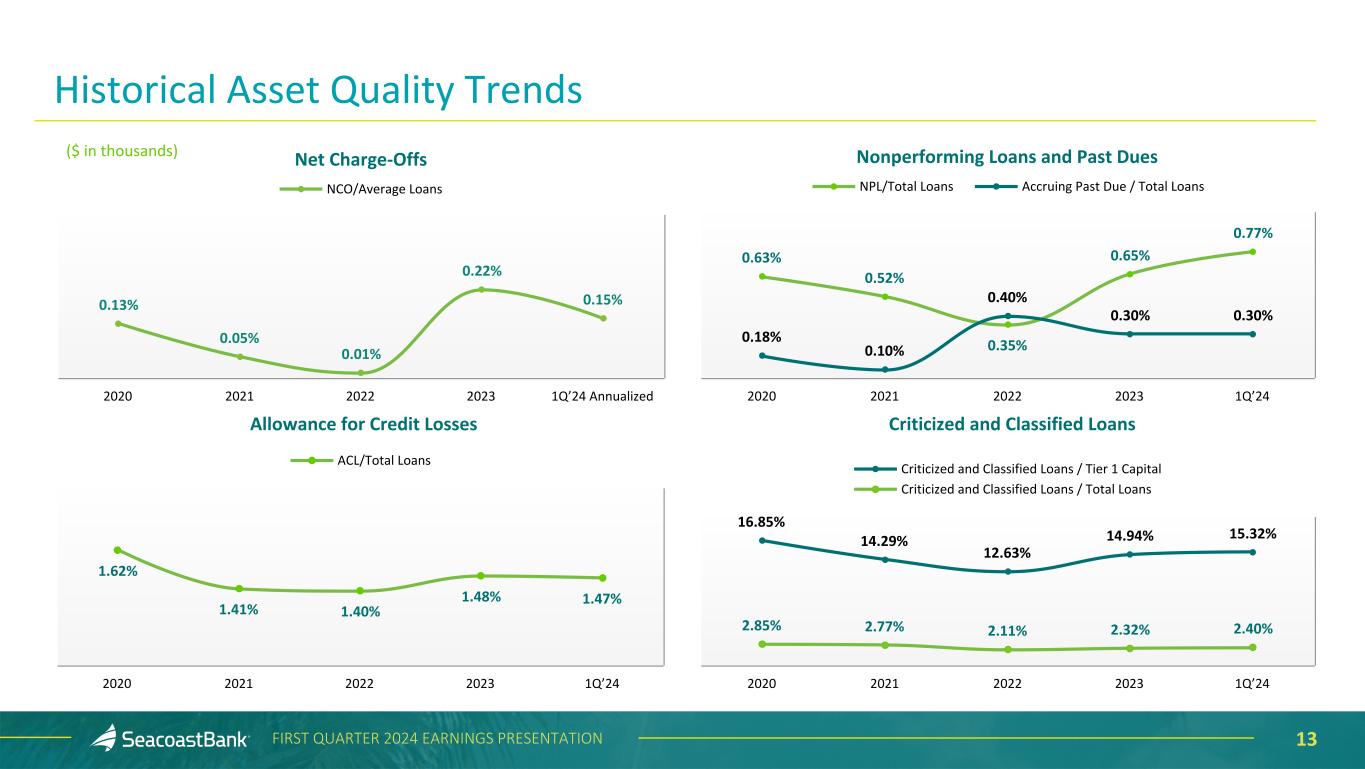 12FIRST QUARTER 2024 EARNINGS PRESENTATION Net Charge-Offs $3,630 NCO NCO/Average Loans 1Q'23 2Q'23 3Q'23 4Q'23 1Q'24 ($ in thousands) $155,640 $159,715 $149,661 $148,931 $146,669 1.54% 1.58% 1.49% 1.48% 1.47% ACL ACL/Total Loans 1Q'23 2Q'23 3Q'23 4Q'23 1Q'24 Allowance for Credit Losses Continued Stable Asset Quality Trends 0.14% 0.19% $3,188 0.03% $705 0.50% $12,748 $4,720 Nonperforming Loans and Past Dues $50,787 $48,326 $41,508 $65,104 $77,205 0.50% 0.48% 0.41% 0.65% 0.77% 0.17% 0.25% 0.33% 0.30% 0.30% NPL NPL/Total Loans Accruing Past Due / Total Loans 1Q'23 2Q'23 3Q'23 4Q'23 1Q'24 $243,672 $210,070 $201,483 $233,916 $239,185 2.40% 2.08% 2.01% 2.32% 2.40% Criticized and Classified Loans Criticized and Classified Loans / Total Loans 1Q'23 2Q'23 3Q'23 4Q'23 1Q'24 Criticized and Classified Loans 0.15%