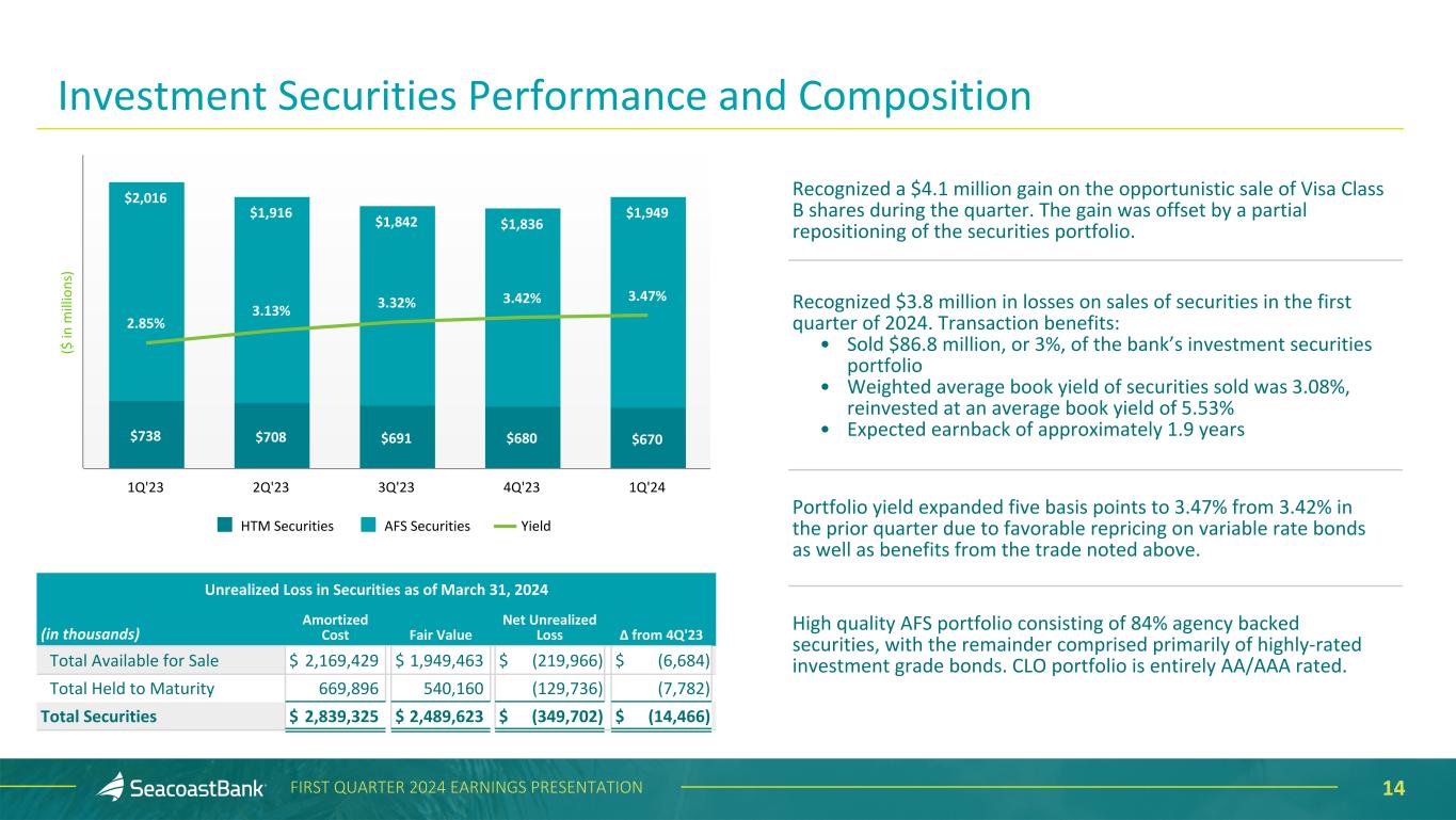 13FIRST QUARTER 2024 EARNINGS PRESENTATION Net Charge-Offs 0.13% 0.05% 0.01% 0.22% 0.15% NCO/Average Loans 2020 2021 2022 2023 1Q’24 Annualized ($ in thousands) Nonperforming Loans and Past Dues 0.63% 0.52% 0.35% 0.65% 0.77% 0.18% 0.10% 0.40% 0.30% 0.30% NPL/Total Loans Accruing Past Due / Total Loans 2020 2021 2022 2023 1Q’24 1.62% 1.41% 1.40% 1.48% 1.47% ACL/Total Loans 2020 2021 2022 2023 1Q’24 Allowance for Credit Losses Historical Asset Quality Trends 16.85% 14.29% 12.63% 14.94% 15.32% 2.85% 2.77% 2.11% 2.32% 2.40% Criticized and Classified Loans / Tier 1 Capital Criticized and Classified Loans / Total Loans 2020 2021 2022 2023 1Q’24 Criticized and Classified Loans