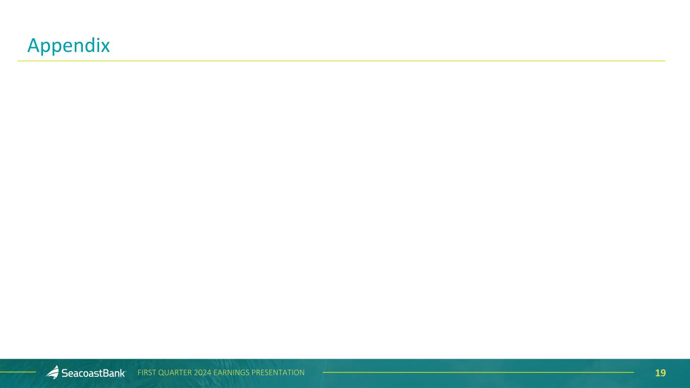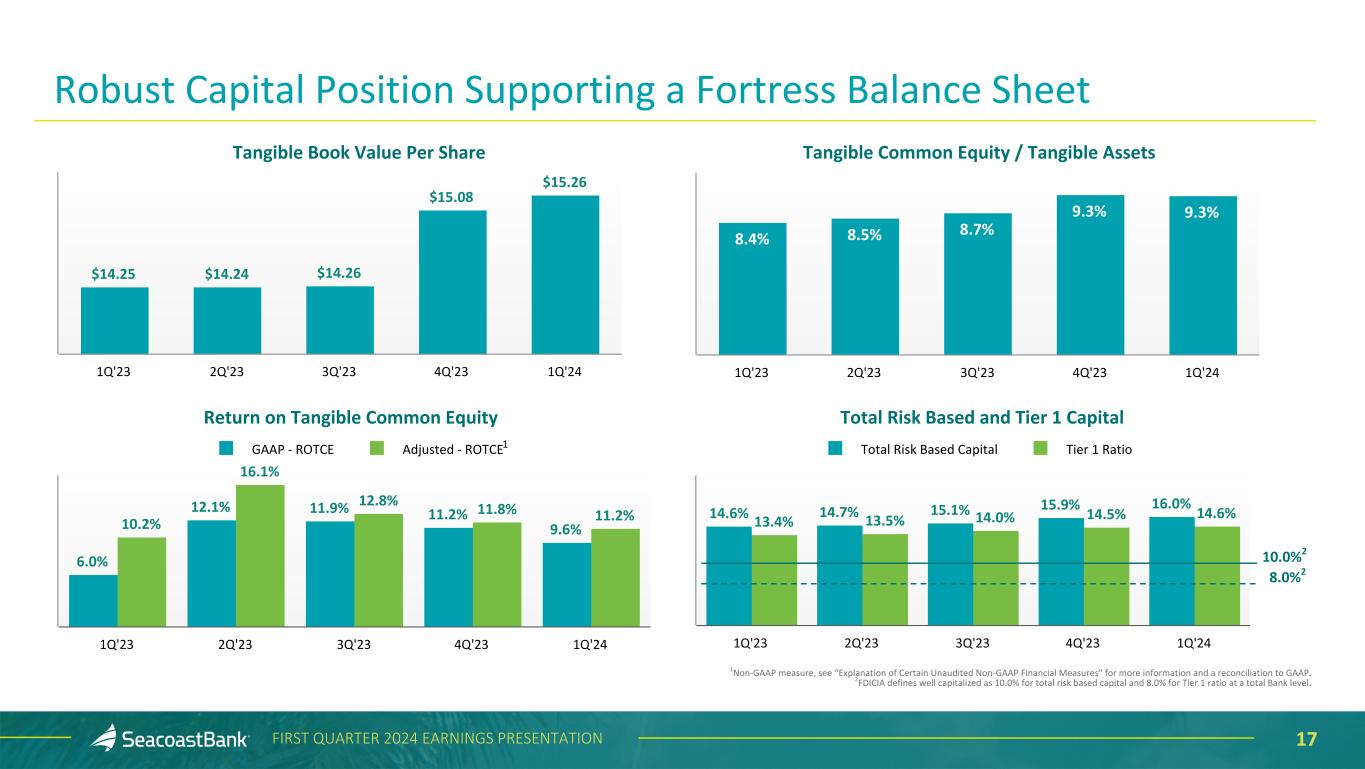 16FIRST QUARTER 2024 EARNINGS PRESENTATION Deposits End-of-Period ($ in millions) $12,310 $12,283 $12,108 $11,777 $12,016 Transaction Accounts Savings Money Market Brokered Time Deposits 1Q'23 2Q'23 3Q'23 4Q'23 1Q'24 Granular, Diverse and Relationship-Focused Customer Funding Base The Company benefits from a granular deposit franchise, with the top ten depositors representing approximately 4% of total deposits. Transaction accounts represent 52% of deposits. Consumer deposits represent 42% of total deposits, with an average balance per account of $25 thousand. Business deposits represent 58% of total deposits, with an average balance per account of $110 thousand. The average tenure for a Seacoast customer is nearly 10 years. 58% 8% 24% 7% 57% 7% 23% 55% 6% 26% 10% 54% 6% 28% 11% 13% 29% 5% 52% 8% 3% 5% 3% 1% 1%