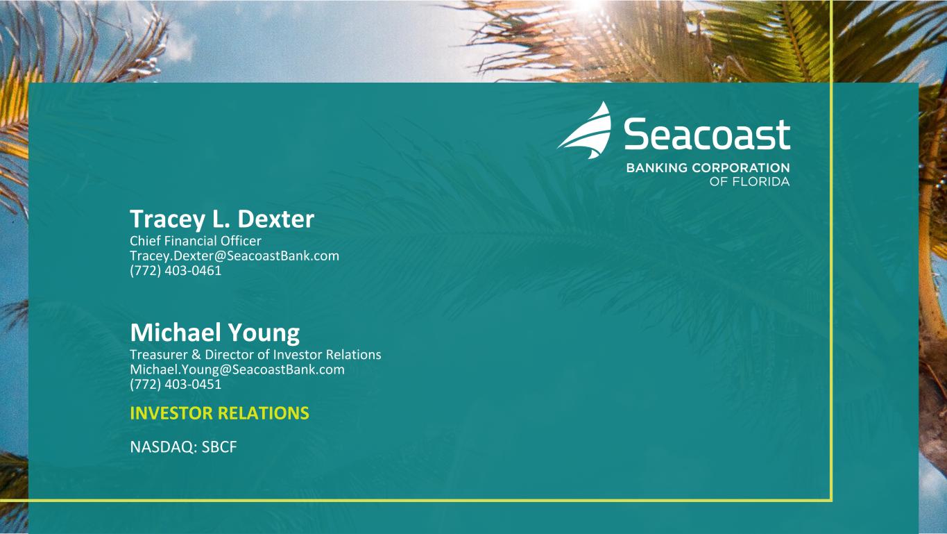 Tracey L. Dexter Chief Financial Officer Tracey.Dexter@SeacoastBank.com (772) 403-0461 Michael Young Treasurer & Director of Investor Relations Michael.Young@SeacoastBank.com (772) 403-0451 INVESTOR RELATIONS NASDAQ: SBCF