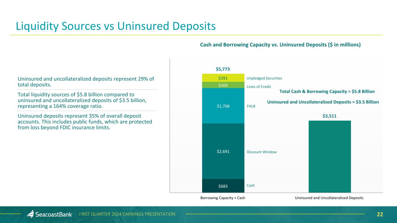 21FIRST QUARTER 2024 EARNINGS PRESENTATION Non-owner Occupied Commercial Real Estate CRE Non-Owner Occupied ($ in ‘000s) Balance Balance % of Total Loans Average Loan Size 30+ Days Past- Accruing Non Accrual Weighted LTV Retail $ 1,120,440 11.2 % $ 2,138 $ — $ 1,608 51 % Office 565,127 5.7 1,605 — 11,521 55 Multifamily 5+ 370,342 3.7 1,824 3,208 — 52 Hotel/Motel 359,446 3.6 3,524 1,659 1,012 50 Industrial/Warehouse 364,790 3.7 1,771 — 831 54 Other 588,194 5.9 967 — 6,216 53 Total $ 3,368,339 33.8 % $ 1,688 $ 4,867 $ 21,188 52 % Retail Segment: Targets grocery or credit tenant anchored shopping plazas, single credit tenant retail buildings, smaller outparcels and other retail units. • 11.2% of total loans. • 51% weighted average loan-to-value, low leverage. • $2.1 million average loan size. • 17 loans over $10 million. Office Segment: Targets low to mid-rise suburban offices, broadly diversified across many professional services. • 5.7% of total loans. • 55% weighted average loan-to-value, low leverage. • $1.6 million average loan size. • Five loans over $10 million.