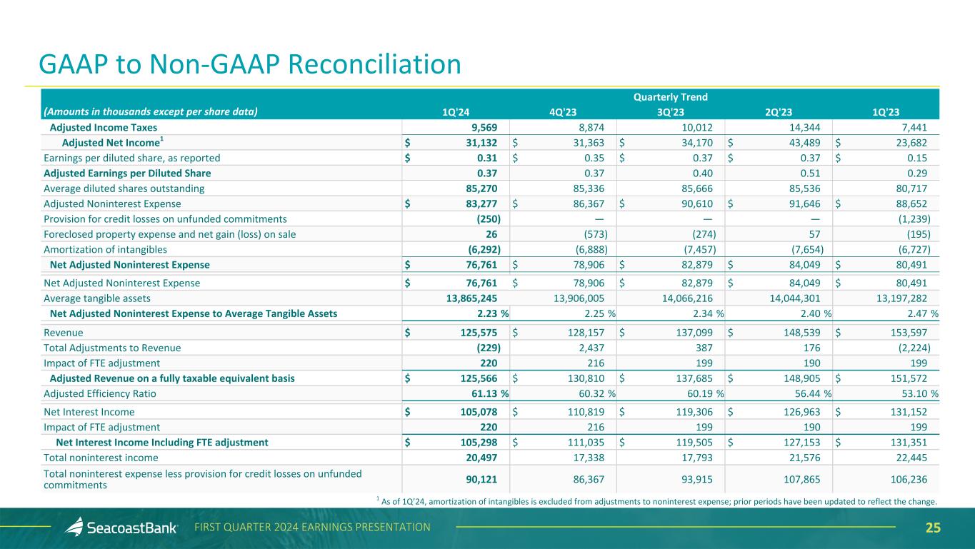 24FIRST QUARTER 2024 EARNINGS PRESENTATION Quarterly Trend (Amounts in thousands except per share data) 1Q'24 4Q'23 3Q'23 2Q'23 1Q'23 Net Income $ 26,006 $ 29,543 $ 31,414 $ 31,249 $ 11,827 Total noninterest income 20,497 17,338 17,793 21,576 22,445 Securities losses (gains), net (229) 2,437 387 176 (107) BOLI benefits on death (included in other income) — — — — (2,117) Total Adjustments to Noninterest Income (229) 2,437 387 176 (2,224) Total Adjusted Noninterest Income 20,268 19,775 18,180 21,752 20,221 Total noninterest expense 90,371 86,367 93,915 107,865 107,475 Merger related charges: Salaries and wages — — — (1,573) (4,240) Outsourced data processing — — — (10,904) (6,551) Legal and professional fees — — — (1,664) (4,789) Other — — — (1,507) (1,952) Total merger-related charges — — — (15,648) (17,532) Branch reductions and other expense initiatives: Salaries and wages (2,073) — (3,201) (462) (539) Outsourced data processing (4,089) — — — — Occupancy (771) — — — — Other (161) — (104) (109) (752) Total branch reductions and other expense initiatives (7,094) — (3,305) (571) (1,291) Adjustments to Noninterest Expense (7,094) — (3,305) (16,219) (18,823) Adjusted Noninterest Expense1 83,277 86,367 90,610 91,646 88,652 Income Taxes 7,830 8,257 9,076 10,189 2,697 Tax effect of adjustments 1,739 617 936 4,155 4,744 GAAP to Non-GAAP Reconciliation 1 As of 1Q’24, amortization of intangibles is excluded from adjustments to noninterest expense; prior periods have been updated to reflect the change.