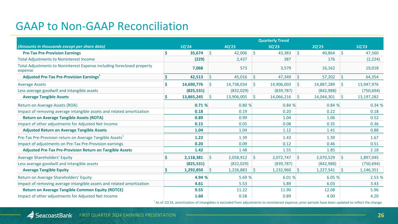 25FIRST QUARTER 2024 EARNINGS PRESENTATION Quarterly Trend (Amounts in thousands except per share data) 1Q'24 4Q'23 3Q'23 2Q'23 1Q'23 Adjusted Income Taxes 9,569 8,874 10,012 14,344 7,441 Adjusted Net Income1 $ 31,132 $ 31,363 $ 34,170 $ 43,489 $ 23,682 Earnings per diluted share, as reported $ 0.31 $ 0.35 $ 0.37 $ 0.37 $ 0.15 Adjusted Earnings per Diluted Share 0.37 0.37 0.40 0.51 0.29 Average diluted shares outstanding 85,270 85,336 85,666 85,536 80,717 Adjusted Noninterest Expense $ 83,277 $ 86,367 $ 90,610 $ 91,646 $ 88,652 Provision for credit losses on unfunded commitments (250) — — — (1,239) Foreclosed property expense and net gain (loss) on sale 26 (573) (274) 57 (195) Amortization of intangibles (6,292) (6,888) (7,457) (7,654) (6,727) Net Adjusted Noninterest Expense $ 76,761 $ 78,906 $ 82,879 $ 84,049 $ 80,491 Net Adjusted Noninterest Expense $ 76,761 $ 78,906 $ 82,879 $ 84,049 $ 80,491 Average tangible assets 13,865,245 13,906,005 14,066,216 14,044,301 13,197,282 Net Adjusted Noninterest Expense to Average Tangible Assets 2.23 % 2.25 % 2.34 % 2.40 % 2.47 % Revenue $ 125,575 $ 128,157 $ 137,099 $ 148,539 $ 153,597 Total Adjustments to Revenue (229) 2,437 387 176 (2,224) Impact of FTE adjustment 220 216 199 190 199 Adjusted Revenue on a fully taxable equivalent basis $ 125,566 $ 130,810 $ 137,685 $ 148,905 $ 151,572 Adjusted Efficiency Ratio 61.13 % 60.32 % 60.19 % 56.44 % 53.10 % Net Interest Income $ 105,078 $ 110,819 $ 119,306 $ 126,963 $ 131,152 Impact of FTE adjustment 220 216 199 190 199 Net Interest Income Including FTE adjustment $ 105,298 $ 111,035 $ 119,505 $ 127,153 $ 131,351 Total noninterest income 20,497 17,338 17,793 21,576 22,445 Total noninterest expense less provision for credit losses on unfunded commitments 90,121 86,367 93,915 107,865 106,236 1 As of 1Q’24, amortization of intangibles is excluded from adjustments to noninterest expense; prior periods have been updated to reflect the change. GAAP to Non-GAAP Reconciliation
