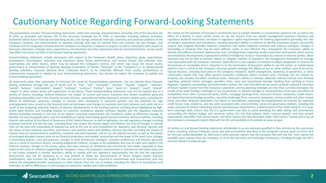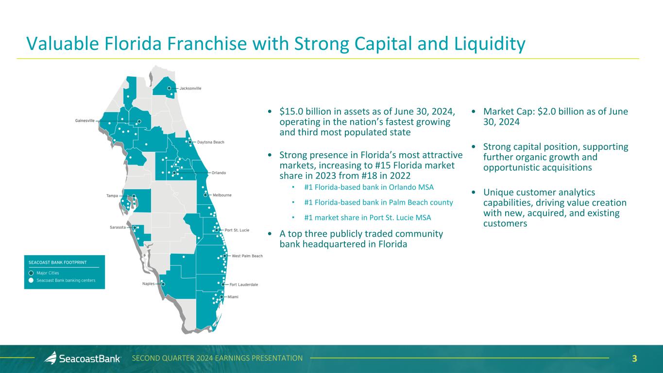 2SECOND QUARTER 2024 EARNINGS PRESENTATION Cautionary Notice Regarding Forward-Looking Statements This presentation contains “forward-looking statements” within the meaning, and protections, of Section 27A of the Securities Act of 1933, as amended, and Section 21E of the Securities Exchange Act of 1934, as amended, including, without limitation, statements about future financial and operating results, cost savings, enhanced revenues, economic and seasonal conditions in the Company’s markets, and improvements to reported earnings that may be realized from cost controls, tax law changes, new initiatives and for integration of banks that the Company has acquired, or expects to acquire, as well as statements with respect to Seacoast's objectives, strategic plans, expectations and intentions and other statements that are not historical facts. Actual results may differ from those set forth in the forward-looking statements. Forward-looking statements include statements with respect to the Company’s beliefs, plans, objectives, goals, expectations, anticipations, assumptions, estimates and intentions about future performance, and involve known and unknown risks, uncertainties and other factors, which may be beyond the Company’s control, and which may cause the actual results, performance or achievements of Seacoast Banking Corporation of Florida (“Seacoast” or the “Company”) or its wholly-owned banking subsidiary, Seacoast National Bank (“Seacoast Bank”), to be materially different from results, performance or achievements expressed or implied by such forward-looking statements. You should not expect the Company to update any forward-looking statements. All statements other than statements of historical fact could be forward-looking statements. You can identify these forward- looking statements through the use of words such as "may", "will", "anticipate", "assume", "should", "support", "indicate", "would", "believe", "contemplate", "expect", "estimate", "continue", "further", "plan", "point to", "project", "could", "intend", "target" or other similar words and expressions of the future. These forward-looking statements may not be realized due to a variety of factors, including, without limitation: the impact of current and future economic and market conditions generally (including seasonality) and in the financial services industry, nationally and within Seacoast’s primary market areas, including the effects of inflationary pressures, changes in interest rates, slowdowns in economic growth, and the potential for high unemployment rates, as well as the financial stress on borrowers and changes to customer and client behavior and credit risk as a result of the foregoing; potential impacts of adverse developments in the banking industry including those highlighted by high- profile bank failures, and including impacts on customer confidence, deposit outflows, liquidity and the regulatory response thereto (including increases in the cost of our deposit insurance assessments), the Company's ability to effectively manage its liquidity risk and any growth plans, and the availability of capital and funding; governmental monetary and fiscal policies, including interest rate policies of the Board of Governors of the Federal Reserve, as well as legislative, tax and regulatory changes including proposed overdraft and late fee caps, including those that impact the money supply and inflation; the risks of changes in interest rates on the level and composition of deposits (as well as the cost of, and competition for, deposits), loan demand, liquidity and the values of loan collateral, securities, and interest rate sensitive assets and liabilities; interest rate risks (including the impacts of interest rates on macroeconomic conditions, customer and client behavior, and on our net interest income), as well as the impact of prolonged elevated interest rates on our financial projections and models, sensitivities and the shape of the yield curve; changes in accounting policies, rules and practices; changes in retail distribution strategies, customer preferences and behavior generally and as a result of economic factors, including heightened inflation; changes in the availability and cost of credit and capital in the financial markets; changes in the prices, values and sales volumes of residential and commercial real estate, especially as they relate to the value of collateral supporting the Company’s loans; the Company’s concentration in commercial real estate loans and in real estate collateral in Florida; Seacoast’s ability to comply with any regulatory requirements; the risk that the regulatory environment may not be conducive to or may prohibit or delay the consummation of future mergers and/or business combinations, may increase the length of time and amount of resources required to consummate such transactions, and may reduce the anticipated benefit; inaccuracies or other failures from the use of models, including the failure of assumptions and estimates, as well as differences in, and changes to, economic, market and credit conditions; the impact on the valuation of Seacoast’s investments due to market volatility or counterparty payment risk, as well as the effect of a decline in stock market prices on our fee income from our wealth management business; statutory and regulatory dividend restrictions; increases in regulatory capital requirements for banking organizations generally; the risks of mergers, acquisitions and divestitures, including Seacoast’s ability to continue to identify acquisition targets, successfully acquire and integrate desirable financial institutions and realize expected revenues and revenue synergies; changes in technology or products that may be more difficult, costly, or less effective than anticipated; the Company’s ability to identify and address increased cybersecurity risks, including those impacting vendors and other third parties which may be