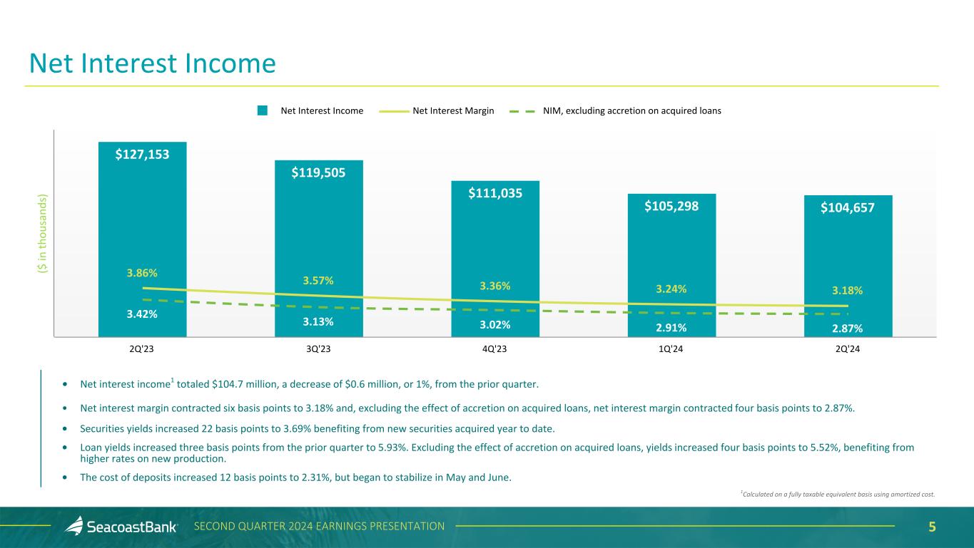 4SECOND QUARTER 2024 EARNINGS PRESENTATION • Net income of $30.2 million, or $0.36 per diluted share. • Four consecutive quarters of lower adjusted noninterest expense1, demonstrating the Company’s focus on driving efficiency while making investments for organic growth. • During the quarter, the cost of deposits began to stabilize in conjunction with emerging loan growth supporting net interest income and the net interest margin. • Pre-tax pre-provision earnings on an adjusted basis1 increased $2.0 million to $44.5 million from the prior quarter. • Continued success in wealth management, with assets under management increasing 12% year to date to reach a record $1.9 billion. • Continued growth in lending pipelines, with the overall pipeline increasing to $834.4 million. • Asset quality remains well controlled, including a reduction in nonperforming loans compared to the prior quarter. • Tangible book value per share increased to $15.41. • Strong capital position, with a Tier 1 capital ratio of 14.8%, and a tangible common equity to tangible assets ratio of 9.3%. • Repurchased 39,892 shares of our common stock at a weighted average price of $22.06. Second Quarter 2024 Highlights 1Non-GAAP measure, see “Explanation of Certain Unaudited Non-GAAP Financial Measures" for more information and a reconciliation to GAAP. Comparisons are to the first quarter of 2024 unless otherwise stated