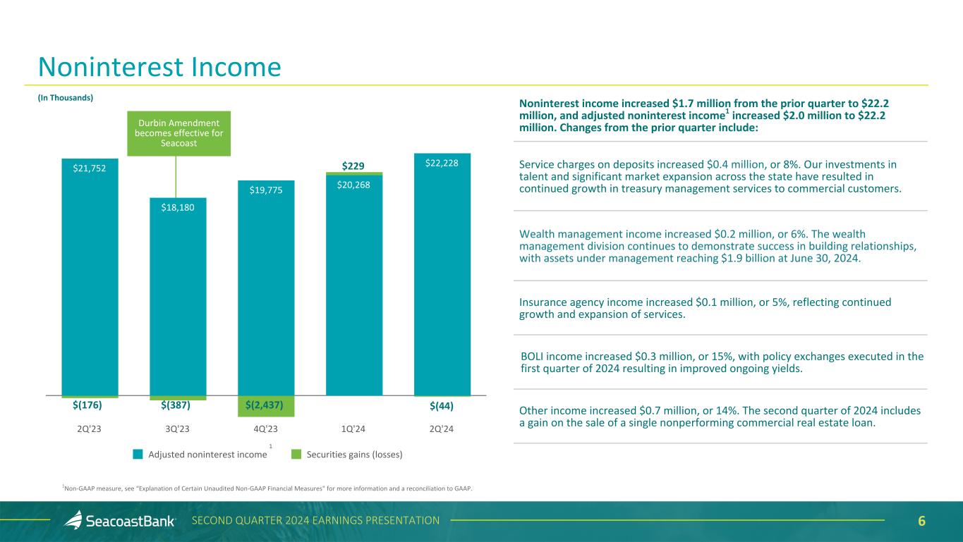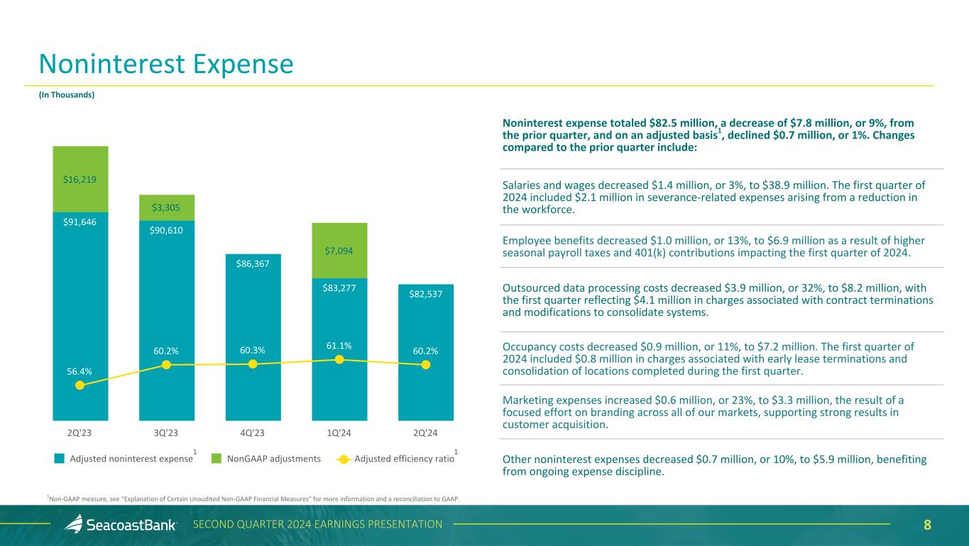 6SECOND QUARTER 2024 EARNINGS PRESENTATION Noninterest income increased $1.7 million from the prior quarter to $22.2 million, and adjusted noninterest income1 increased $2.0 million to $22.2 million. Changes from the prior quarter include: Service charges on deposits increased $0.4 million, or 8%. Our investments in talent and significant market expansion across the state have resulted in continued growth in treasury management services to commercial customers. Wealth management income increased $0.2 million, or 6%. The wealth management division continues to demonstrate success in building relationships, with assets under management reaching $1.9 billion at June 30, 2024. Insurance agency income increased $0.1 million, or 5%, reflecting continued growth and expansion of services. BOLI income increased $0.3 million, or 15%, with policy exchanges executed in the first quarter of 2024 resulting in improved ongoing yields. Other income increased $0.7 million, or 14%. The second quarter of 2024 includes a gain on the sale of a single nonperforming commercial real estate loan. 1Non-GAAP measure, see “Explanation of Certain Unaudited Non-GAAP Financial Measures" for more information and a reconciliation to GAAP. Noninterest Income $21,752 $18,180 $19,775 $20,268 $22,228 $(44) Adjusted noninterest income Securities gains (losses) 2Q'23 3Q'23 4Q'23 1Q'24 2Q'24 (In Thousands) 1 $229 $(176) $(387) $(2,437) Durbin Amendment becomes effective for Seacoast