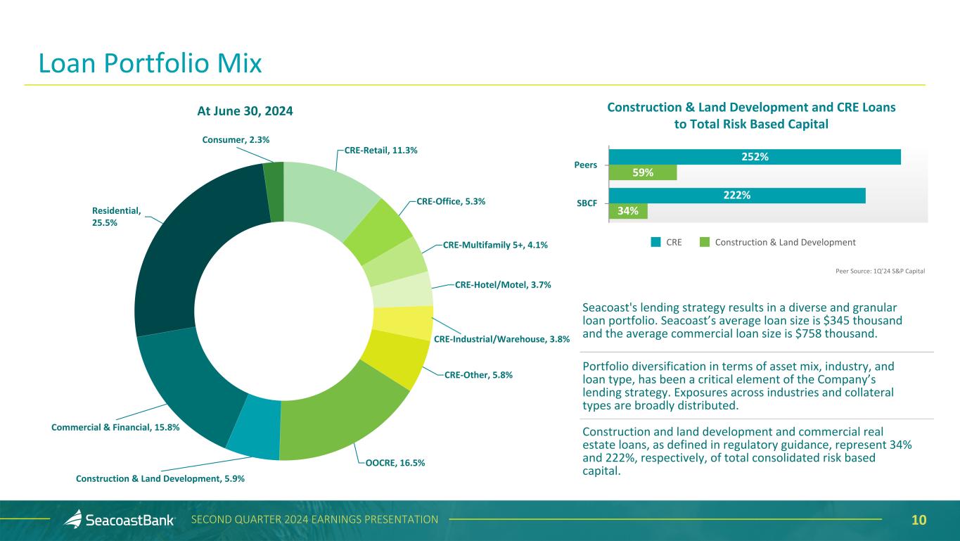 9SECOND QUARTER 2024 EARNINGS PRESENTATION $285 $353 $393 $573 $834 $519 $245 $478 $394 $538 Pipeline Originations 2Q'23 3Q'23 4Q'23 1Q'24 2Q'24 Loan Pipeline End-of-Period vs Originations (in millions) $10,118 $10,011 $10,063 $9,978 $10,039 5.89% 5.93% 5.85% 5.90% 5.93% 5.31% 5.34% 5.40% 5.48% 5.52% Yield Excluding Accretion on Acquired Loans Reported Yield Total Loans 2Q'23 3Q'23 4Q'23 1Q'24 2Q'24 Total Loans End-of-Period ($ in millions) Disciplined Approach to Lending in a Strong Florida Economy Loans outstanding increased by $60.5 million, or 2.4% annualized, from the prior quarter. Loan pipelines increased by 46% from the prior quarter to $834.4 million. Loan yields increased three basis points from the prior quarter to 5.93%. Excluding the effect of accretion on acquired loans, yields increased four basis points to 5.52%, with increases from higher rates and new production.
