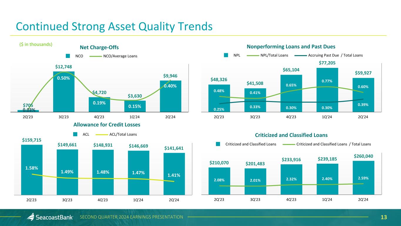 12SECOND QUARTER 2024 EARNINGS PRESENTATION Net Charge-Offs 0.13% 0.05% 0.01% 0.22% 0.27% NCO/Average Loans 2020 2021 2022 2023 2024 (YTD Annualized) Nonperforming Loans and Past Dues 0.63% 0.52% 0.35% 0.65% 0.60% 0.18% 0.10% 0.40% 0.30% 0.39% NPL/Total Loans Accruing Past Due / Total Loans 2020 2021 2022 2023 2Q'24 1.62% 1.41% 1.40% 1.48% 1.41% ACL/Total Loans 2020 2021 2022 2023 2Q'24 Allowance for Credit Losses Historical Asset Quality Trends 16.85% 14.29% 12.63% 14.94% 16.43% 2.85% 2.77% 2.11% 2.32% 2.59% Criticized and Classified Loans / Tier 1 Capital Criticized and Classified Loans / Total Loans 2020 2021 2022 2023 2Q'24 Criticized and Classified Loans