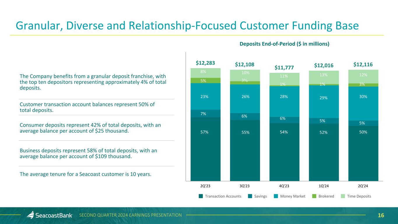 15SECOND QUARTER 2024 EARNINGS PRESENTATION Deposits End-of-Period ($ in millions) $12,283 $12,108 $11,777 $12,016 $12,116 5.25% 5.50% 5.50% 5.50% 5.50% 1.38% 1.79% 2.00% 2.19% 2.31% Total Deposits Fed Funds Cost of Deposits 2Q'23 3Q'23 4Q'23 1Q'24 2Q'24 Distinctive Deposit Franchise Supported by Attractive Markets Total deposits increased $100.3 million, or 3% annualized, ending the quarter at $12.1 billion. Continued focus on organic growth and relationship-based funding, in combination with our innovative analytics platform, supports a well-diversified, low-cost deposit portfolio. Average deposits per banking center were $157 million. 2024 Monthly Cost of Deposits 2.14% 2.20% 2.23% 2.27% 2.33% 2.33% Jan'24 Feb'24 Mar'24 Apr'24 May'24 Jun'24 Cost of deposits stabilizing