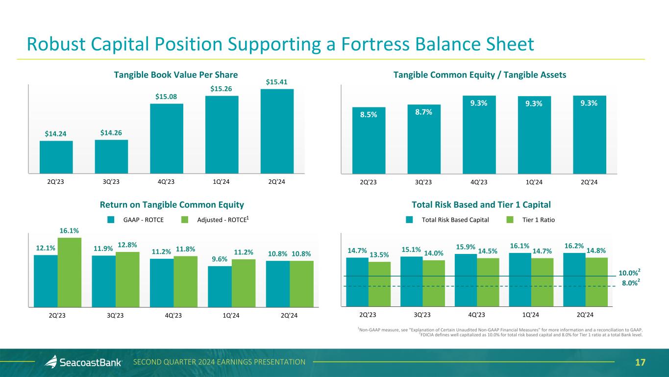 16SECOND QUARTER 2024 EARNINGS PRESENTATION Deposits End-of-Period ($ in millions) $12,283 $12,108 $11,777 $12,016 $12,116 Transaction Accounts Savings Money Market Brokered Time Deposits 2Q'23 3Q'23 4Q'23 1Q'24 2Q'24 Granular, Diverse and Relationship-Focused Customer Funding Base The Company benefits from a granular deposit franchise, with the top ten depositors representing approximately 4% of total deposits. Customer transaction account balances represent 50% of total deposits. Consumer deposits represent 42% of total deposits, with an average balance per account of $25 thousand. Business deposits represent 58% of total deposits, with an average balance per account of $109 thousand. The average tenure for a Seacoast customer is 10 years. 50%52%54%55%57% 5%5%6%6%7% 23% 26% 28% 29% 30% 5% 3% 1% 1% 3% 8% 10% 11% 13% 12%