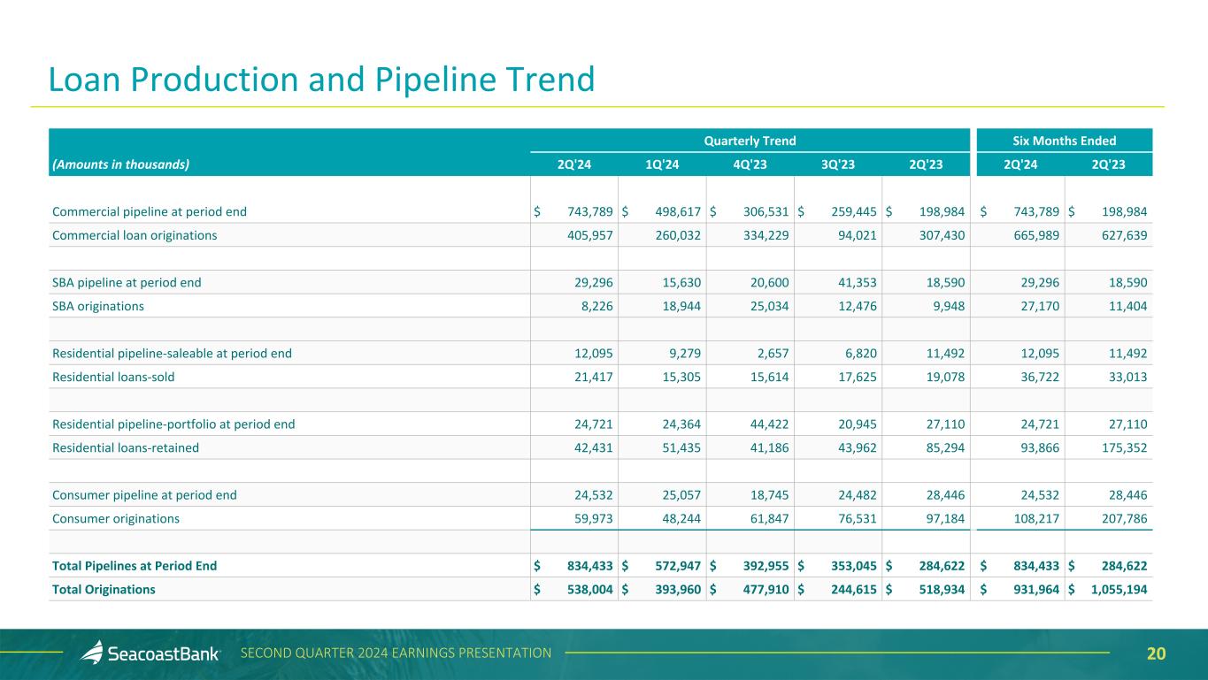 20SECOND QUARTER 2024 EARNINGS PRESENTATION Quarterly Trend Six Months Ended (Amounts in thousands) 2Q'24 1Q'24 4Q'23 3Q'23 2Q'23 2Q'24 2Q'23 Commercial pipeline at period end $ 743,789 $ 498,617 $ 306,531 $ 259,445 $ 198,984 $ 743,789 $ 198,984 Commercial loan originations 405,957 260,032 334,229 94,021 307,430 665,989 627,639 SBA pipeline at period end 29,296 15,630 20,600 41,353 18,590 29,296 18,590 SBA originations 8,226 18,944 25,034 12,476 9,948 27,170 11,404 Residential pipeline-saleable at period end 12,095 9,279 2,657 6,820 11,492 12,095 11,492 Residential loans-sold 21,417 15,305 15,614 17,625 19,078 36,722 33,013 Residential pipeline-portfolio at period end 24,721 24,364 44,422 20,945 27,110 24,721 27,110 Residential loans-retained 42,431 51,435 41,186 43,962 85,294 93,866 175,352 Consumer pipeline at period end 24,532 25,057 18,745 24,482 28,446 24,532 28,446 Consumer originations 59,973 48,244 61,847 76,531 97,184 108,217 207,786 Total Pipelines at Period End $ 834,433 $ 572,947 $ 392,955 $ 353,045 $ 284,622 $ 834,433 $ 284,622 Total Originations $ 538,004 $ 393,960 $ 477,910 $ 244,615 $ 518,934 $ 931,964 $ 1,055,194 Loan Production and Pipeline Trend