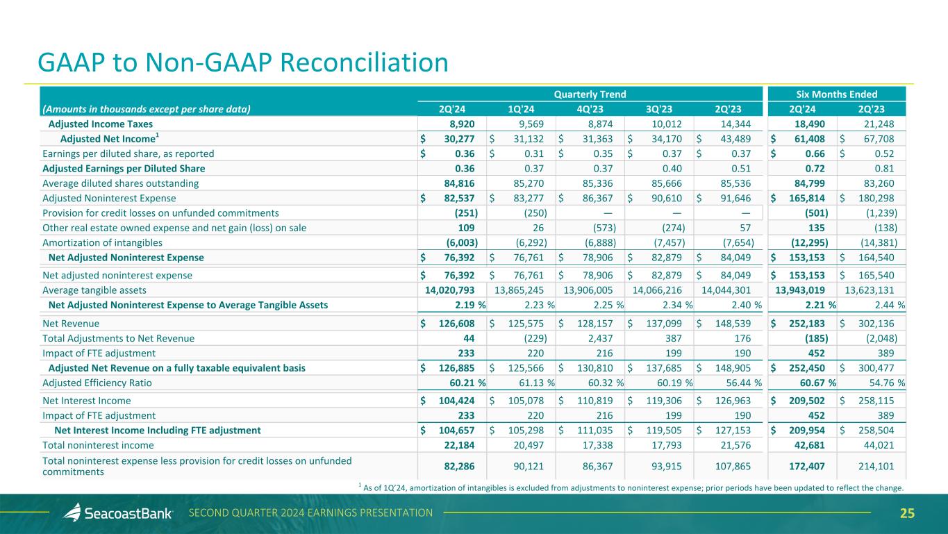 24SECOND QUARTER 2024 EARNINGS PRESENTATION Quarterly Trend Six Months Ended (Amounts in thousands except per share data) 2Q'24 1Q'24 4Q'23 3Q'23 2Q'23 2Q'24 2Q'23 Net Income $ 30,244 $ 26,006 $ 29,543 $ 31,414 $ 31,249 $ 56,250 $ 43,076 Total noninterest income 22,184 20,497 17,338 17,793 21,576 42,681 44,021 Securities losses (gains), net 44 (229) 2,437 387 176 (185) 69 BOLI benefits on death (included in other income) — — — — — — (2,117) Total Adjustments to Noninterest Income 44 (229) 2,437 387 176 (185) (2,048) Total Adjusted Noninterest Income 22,228 20,268 19,775 18,180 21,752 42,496 41,973 Total noninterest expense 82,537 90,371 86,367 93,915 107,865 172,908 215,340 Merger related charges: Salaries and wages — — — — (1,573) — (5,813) Outsourced data processing — — — — (10,904) — (17,455) Legal and professional fees — — — — (1,664) — (6,453) Other — — — — (1,507) — (3,459) Total merger-related charges — — — — (15,648) — (33,180) Branch reductions and other expense initiatives: Salaries and wages — (2,073) — (3,201) (462) (2,073) (1,081) Outsourced data processing — (4,089) — — — (4,089) — Occupancy — (771) — — — (771) (774) Other — (161) — (104) (109) (161) (7) Total branch reductions and other expense initiatives — (7,094) — (3,305) (571) (7,094) (1,862) Adjustments to Noninterest Expense — (7,094) — (3,305) (16,219) (7,094) (35,042) Adjusted Noninterest Expense1 82,537 83,277 86,367 90,610 91,646 165,814 180,298 Income Taxes 8,909 7,830 8,257 9,076 10,189 16,739 12,886 Tax effect of adjustments 11 1,739 617 936 4,155 1,751 8,362 GAAP to Non-GAAP Reconciliation 1 As of 1Q’24, amortization of intangibles is excluded from adjustments to noninterest expense; prior periods have been updated to reflect the change.