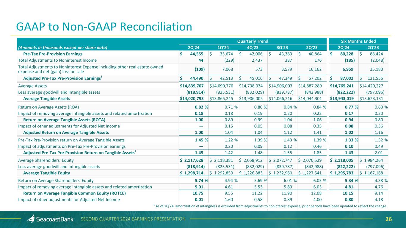 25SECOND QUARTER 2024 EARNINGS PRESENTATION Quarterly Trend Six Months Ended (Amounts in thousands except per share data) 2Q'24 1Q'24 4Q'23 3Q'23 2Q'23 2Q'24 2Q'23 Adjusted Income Taxes 8,920 9,569 8,874 10,012 14,344 18,490 21,248 Adjusted Net Income1 $ 30,277 $ 31,132 $ 31,363 $ 34,170 $ 43,489 $ 61,408 $ 67,708 Earnings per diluted share, as reported $ 0.36 $ 0.31 $ 0.35 $ 0.37 $ 0.37 $ 0.66 $ 0.52 Adjusted Earnings per Diluted Share 0.36 0.37 0.37 0.40 0.51 0.72 0.81 Average diluted shares outstanding 84,816 85,270 85,336 85,666 85,536 84,799 83,260 Adjusted Noninterest Expense $ 82,537 $ 83,277 $ 86,367 $ 90,610 $ 91,646 $ 165,814 $ 180,298 Provision for credit losses on unfunded commitments (251) (250) — — — (501) (1,239) Other real estate owned expense and net gain (loss) on sale 109 26 (573) (274) 57 135 (138) Amortization of intangibles (6,003) (6,292) (6,888) (7,457) (7,654) (12,295) (14,381) Net Adjusted Noninterest Expense $ 76,392 $ 76,761 $ 78,906 $ 82,879 $ 84,049 $ 153,153 $ 164,540 Net adjusted noninterest expense $ 76,392 $ 76,761 $ 78,906 $ 82,879 $ 84,049 $ 153,153 $ 165,540 Average tangible assets 14,020,793 13,865,245 13,906,005 14,066,216 14,044,301 13,943,019 13,623,131 Net Adjusted Noninterest Expense to Average Tangible Assets 2.19 % 2.23 % 2.25 % 2.34 % 2.40 % 2.21 % 2.44 % Net Revenue $ 126,608 $ 125,575 $ 128,157 $ 137,099 $ 148,539 $ 252,183 $ 302,136 Total Adjustments to Net Revenue 44 (229) 2,437 387 176 (185) (2,048) Impact of FTE adjustment 233 220 216 199 190 452 389 Adjusted Net Revenue on a fully taxable equivalent basis $ 126,885 $ 125,566 $ 130,810 $ 137,685 $ 148,905 $ 252,450 $ 300,477 Adjusted Efficiency Ratio 60.21 % 61.13 % 60.32 % 60.19 % 56.44 % 60.67 % 54.76 % Net Interest Income $ 104,424 $ 105,078 $ 110,819 $ 119,306 $ 126,963 $ 209,502 $ 258,115 Impact of FTE adjustment 233 220 216 199 190 452 389 Net Interest Income Including FTE adjustment $ 104,657 $ 105,298 $ 111,035 $ 119,505 $ 127,153 $ 209,954 $ 258,504 Total noninterest income 22,184 20,497 17,338 17,793 21,576 42,681 44,021 Total noninterest expense less provision for credit losses on unfunded commitments 82,286 90,121 86,367 93,915 107,865 172,407 214,101 1 As of 1Q’24, amortization of intangibles is excluded from adjustments to noninterest expense; prior periods have been updated to reflect the change. GAAP to Non-GAAP Reconciliation