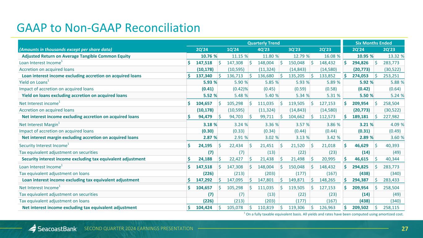 26SECOND QUARTER 2024 EARNINGS PRESENTATION Quarterly Trend Six Months Ended (Amounts in thousands except per share data) 2Q'24 1Q'24 4Q'23 3Q'23 2Q'23 2Q'24 2Q'23 Pre-Tax Pre-Provision Earnings $ 44,555 $ 35,674 $ 42,006 $ 43,383 $ 40,864 $ 80,228 $ 88,424 Total Adjustments to Noninterest Income 44 (229) 2,437 387 176 (185) (2,048) Total Adjustments to Noninterest Expense including other real estate owned expense and net (gain) loss on sale (109) 7,068 573 3,579 16,162 6,959 35,180 Adjusted Pre-Tax Pre-Provision Earnings1 $ 44,490 $ 42,513 $ 45,016 $ 47,349 $ 57,202 $ 87,002 $ 121,556 Average Assets $ 14,839,707 $ 14,690,776 $ 14,738,034 $ 14,906,003 $ 14,887,289 $ 14,765,241 $ 14,420,227 Less average goodwill and intangible assets (818,914) (825,531) (832,029) (839,787) (842,988) (822,222) (797,096) Average Tangible Assets $ 14,020,793 $ 13,865,245 $ 13,906,005 $ 14,066,216 $ 14,044,301 $ 13,943,019 $ 13,623,131 Return on Average Assets (ROA) 0.82 % 0.71 % 0.80 % 0.84 % 0.84 % 0.77 % 0.60 % Impact of removing average intangible assets and related amortization 0.18 0.18 0.19 0.20 0.22 0.17 0.20 Return on Average Tangible Assets (ROTA) 1.00 0.89 0.99 1.04 1.06 0.94 0.80 Impact of other adjustments for Adjusted Net Income — 0.15 0.05 0.08 0.35 0.08 0.36 Adjusted Return on Average Tangible Assets 1.00 1.04 1.04 1.12 1.41 1.02 1.16 Pre-Tax Pre-Provision return on Average Tangible Assets 1.45 % 1.22 % 1.39 % 1.43 % 1.39 % 1.33 % 1.52 % Impact of adjustments on Pre-Tax Pre-Provision earnings — 0.20 0.09 0.12 0.46 0.10 0.49 Adjusted Pre-Tax Pre-Provision Return on Tangible Assets1 1.45 1.42 1.48 1.55 1.85 1.43 2.01 Average Shareholders' Equity $ 2,117,628 $ 2,118,381 $ 2,058,912 $ 2,072,747 $ 2,070,529 $ 2,118,005 $ 1,984,264 Less average goodwill and intangible assets (818,914) (825,531) (832,029) (839,787) (842,988) (822,222) (797,096) Average Tangible Equity $ 1,298,714 $ 1,292,850 $ 1,226,883 $ 1,232,960 $ 1,227,541 $ 1,295,783 $ 1,187,168 Return on Average Shareholders' Equity 5.74 % 4.94 % 5.69 % 6.01 % 6.05 % 5.34 % 4.38 % Impact of removing average intangible assets and related amortization 5.01 4.61 5.53 5.89 6.03 4.81 4.76 Return on Average Tangible Common Equity (ROTCE) 10.75 9.55 11.22 11.90 12.08 10.15 9.14 Impact of other adjustments for Adjusted Net Income 0.01 1.60 0.58 0.89 4.00 0.80 4.18 1 As of 1Q’24, amortization of intangibles is excluded from adjustments to noninterest expense; prior periods have been updated to reflect the change. GAAP to Non-GAAP Reconciliation