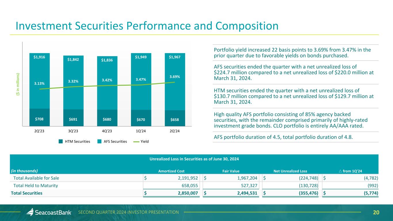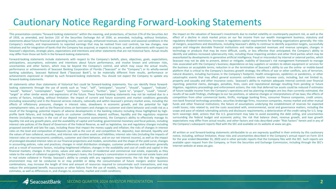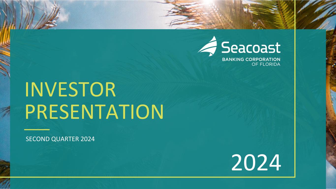 2SECOND QUARTER 2024 INVESTOR PRESENTATION Cautionary Notice Regarding Forward-Looking Statements This presentation contains “forward-looking statements” within the meaning, and protections, of Section 27A of the Securities Act of 1933, as amended, and Section 21E of the Securities Exchange Act of 1934, as amended, including, without limitation, statements about future financial and operating results, cost savings, enhanced revenues, economic and seasonal conditions in the Company’s markets, and improvements to reported earnings that may be realized from cost controls, tax law changes, new initiatives and for integration of banks that the Company has acquired, or expects to acquire, as well as statements with respect to Seacoast's objectives, strategic plans, expectations and intentions and other statements that are not historical facts. Actual results may differ from those set forth in the forward-looking statements. Forward-looking statements include statements with respect to the Company’s beliefs, plans, objectives, goals, expectations, anticipations, assumptions, estimates and intentions about future performance, and involve known and unknown risks, uncertainties and other factors, which may be beyond the Company’s control, and which may cause the actual results, performance or achievements of Seacoast Banking Corporation of Florida (“Seacoast” or the “Company”) or its wholly-owned banking subsidiary, Seacoast National Bank (“Seacoast Bank”), to be materially different from results, performance or achievements expressed or implied by such forward-looking statements. You should not expect the Company to update any forward-looking statements. All statements other than statements of historical fact could be forward-looking statements. You can identify these forward- looking statements through the use of words such as "may", "will", "anticipate", "assume", "should", "support", "indicate", "would", "believe", "contemplate", "expect", "estimate", "continue", "further", "plan", "point to", "project", "could", "intend", "target" or other similar words and expressions of the future. These forward-looking statements may not be realized due to a variety of factors, including, without limitation: the impact of current and future economic and market conditions generally (including seasonality) and in the financial services industry, nationally and within Seacoast’s primary market areas, including the effects of inflationary pressures, changes in interest rates, slowdowns in economic growth, and the potential for high unemployment rates, as well as the financial stress on borrowers and changes to customer and client behavior and credit risk as a result of the foregoing; potential impacts of adverse developments in the banking industry including those highlighted by high- profile bank failures, and including impacts on customer confidence, deposit outflows, liquidity and the regulatory response thereto (including increases in the cost of our deposit insurance assessments), the Company's ability to effectively manage its liquidity risk and any growth plans, and the availability of capital and funding; governmental monetary and fiscal policies, including interest rate policies of the Board of Governors of the Federal Reserve, as well as legislative, tax and regulatory changes including proposed overdraft and late fee caps, including those that impact the money supply and inflation; the risks of changes in interest rates on the level and composition of deposits (as well as the cost of, and competition for, deposits), loan demand, liquidity and the values of loan collateral, securities, and interest rate sensitive assets and liabilities; interest rate risks (including the impacts of interest rates on macroeconomic conditions, customer and client behavior, and on our net interest income), as well as the impact of prolonged elevated interest rates on our financial projections and models, sensitivities and the shape of the yield curve; changes in accounting policies, rules and practices; changes in retail distribution strategies, customer preferences and behavior generally and as a result of economic factors, including heightened inflation; changes in the availability and cost of credit and capital in the financial markets; changes in the prices, values and sales volumes of residential and commercial real estate, especially as they relate to the value of collateral supporting the Company’s loans; the Company’s concentration in commercial real estate loans and in real estate collateral in Florida; Seacoast’s ability to comply with any regulatory requirements; the risk that the regulatory environment may not be conducive to or may prohibit or delay the consummation of future mergers and/or business combinations, may increase the length of time and amount of resources required to consummate such transactions, and may reduce the anticipated benefit; inaccuracies or other failures from the use of models, including the failure of assumptions and estimates, as well as differences in, and changes to, economic, market and credit conditions; the impact on the valuation of Seacoast’s investments due to market volatility or counterparty payment risk, as well as the effect of a decline in stock market prices on our fee income from our wealth management business; statutory and regulatory dividend restrictions; increases in regulatory capital requirements for banking organizations generally; the risks of mergers, acquisitions and divestitures, including Seacoast’s ability to continue to identify acquisition targets, successfully acquire and integrate desirable financial institutions and realize expected revenues and revenue synergies; changes in technology or products that may be more difficult, costly, or less effective than anticipated; the Company’s ability to identify and address increased cybersecurity risks, including those impacting vendors and other third parties which may be