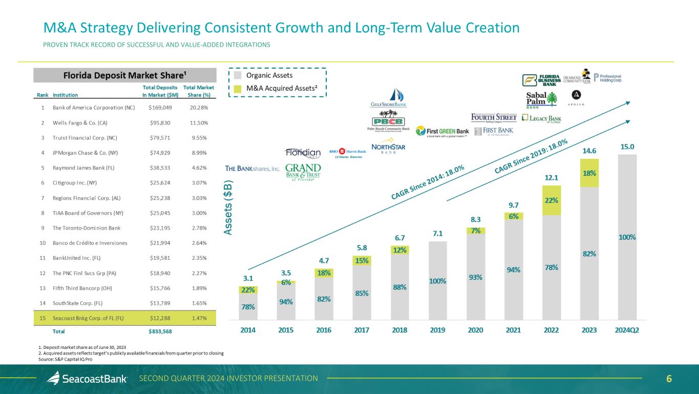 5SECOND QUARTER 2024 INVESTOR PRESENTATION • $15.0 billion in assets as of June 30, 2024, operating in the nation’s fastest growing and third most populated state • Strong presence in Florida’s most attractive markets, increasing to #15 Florida market share in 2023 from #18 in 2022 ▪ #1 Florida-based bank in Orlando MSA ▪ #1 Florida-based bank in Palm Beach county ▪ #1 market share in Port St. Lucie MSA • A top three publicly traded community bank headquartered in Florida • Market Cap: $2.0 billion as of June 30, 2024 • Strong capital position, supporting further organic growth and opportunistic acquisitions • Unique customer analytics capabilities, driving value creation with new, acquired, and existing customers Valuable Florida Franchise with Strong Capital and Liquidity