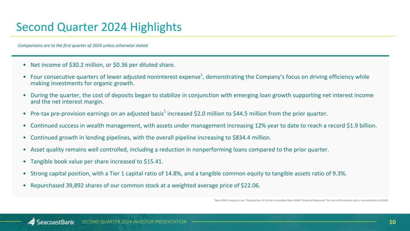 8SECOND QUARTER 2024 INVESTOR PRESENTATION Executing Our Balanced Growth Strategy BUILD the business to become the dominant commercial bank in Florida ▪ Organic growth leveraging technology and high performance culture to attract best banking talent in Florida from larger regionals ▪ Opportunistic acquisitions leveraging our proven M&A capabilities MATURE the business with a solid and scalable foundation moving to mid-size bank ▪ Systems and data infrastructure to efficiently support added scale and complexity, nurturing a culture of insight-driven decision making ▪ Scale enterprise risk capabilities to further align with mid-size bank regulatory standards and expectations ENERGIZE the business fostering a high performing, client centric culture united around nearly 100-year history ▪ Continue to attract and reward top talent and a diverse workforce ▪ Continue momentum around end-to- end local market ownership demonstrating collaboration that drives one-team, one Seacoast