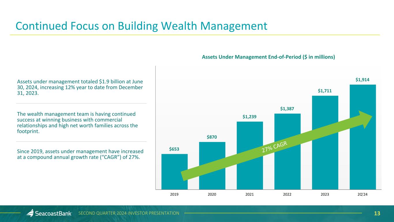12SECOND QUARTER 2024 INVESTOR PRESENTATION Noninterest income increased $1.7 million from the prior quarter to $22.2 million, and adjusted noninterest income1 increased $2.0 million to $22.2 million. Changes from the prior quarter include: Service charges on deposits increased $0.4 million, or 8%. Our investments in talent and significant market expansion across the state have resulted in continued growth in treasury management services to commercial customers. Wealth management income increased $0.2 million, or 6%. The wealth management division continues to demonstrate success in building relationships, with assets under management reaching $1.9 billion at June 30, 2024. Insurance agency income increased $0.1 million, or 5%, reflecting continued growth and expansion of services. BOLI income increased $0.3 million, or 15%, with policy exchanges executed in the first quarter of 2024 resulting in improved ongoing yields. Other income increased $0.7 million, or 14%. The second quarter of 2024 includes a gain on the sale of a single nonperforming commercial real estate loan. 1Non-GAAP measure, see “Explanation of Certain Unaudited Non-GAAP Financial Measures" for more information and a reconciliation to GAAP. Noninterest Income $21,752 $18,180 $19,775 $20,268 $22,228 $(44) Adjusted noninterest income Securities gains (losses) 2Q'23 3Q'23 4Q'23 1Q'24 2Q'24 (In Thousands) 1 $229 $(176) $(387) $(2,437) Durbin Amendment becomes effective for Seacoast