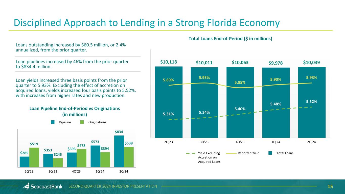 15SECOND QUARTER 2024 INVESTOR PRESENTATION $285 $353 $393 $573 $834 $519 $245 $478 $394 $538 Pipeline Originations 2Q'23 3Q'23 4Q'23 1Q'24 2Q'24 Loan Pipeline End-of-Period vs Originations (in millions) $10,118 $10,011 $10,063 $9,978 $10,039 5.89% 5.93% 5.85% 5.90% 5.93% 5.31% 5.34% 5.40% 5.48% 5.52% Yield Excluding Accretion on Acquired Loans Reported Yield Total Loans 2Q'23 3Q'23 4Q'23 1Q'24 2Q'24 Total Loans End-of-Period ($ in millions) Disciplined Approach to Lending in a Strong Florida Economy Loans outstanding increased by $60.5 million, or 2.4% annualized, from the prior quarter. Loan pipelines increased by 46% from the prior quarter to $834.4 million. Loan yields increased three basis points from the prior quarter to 5.93%. Excluding the effect of accretion on acquired loans, yields increased four basis points to 5.52%, with increases from higher rates and new production.